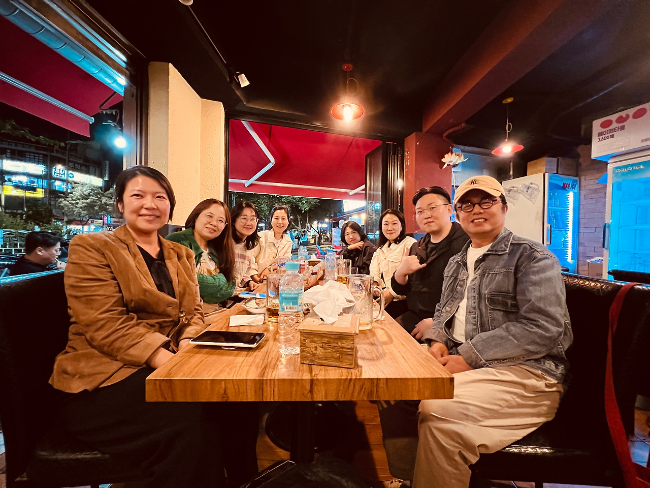 강연이 끝나고 8시 40분에 한성대입구역 2번출구에 있는 호프집 ‘꼬꼬댁꼬꼬’에 갔습니다. 제가 김밥 사러 가는 길에 들러 ‘무슨 일이 있어도 8시 40분까지는 올 테니 아홉 명 앉을자리를 만들어 달라’ 부탁을 했거든요. 손님이 오면 귀찮아하는 표정을 시전 하시는 사장님이 어제는 웬일로 반갑게 저희를 맞았고 맥주도 시원시원하게 가져다주시더군요. 물론 단체사진 한 장만 찍어 달라는 저희 부탁엔 얼굴을 찡그리며 바깥 간이테이블에서 술을 마시고 있던 단골손님에게 “야, 너 와서 사진 좀 찍어드려!”라고 소리를 질렀지만 말입니다.