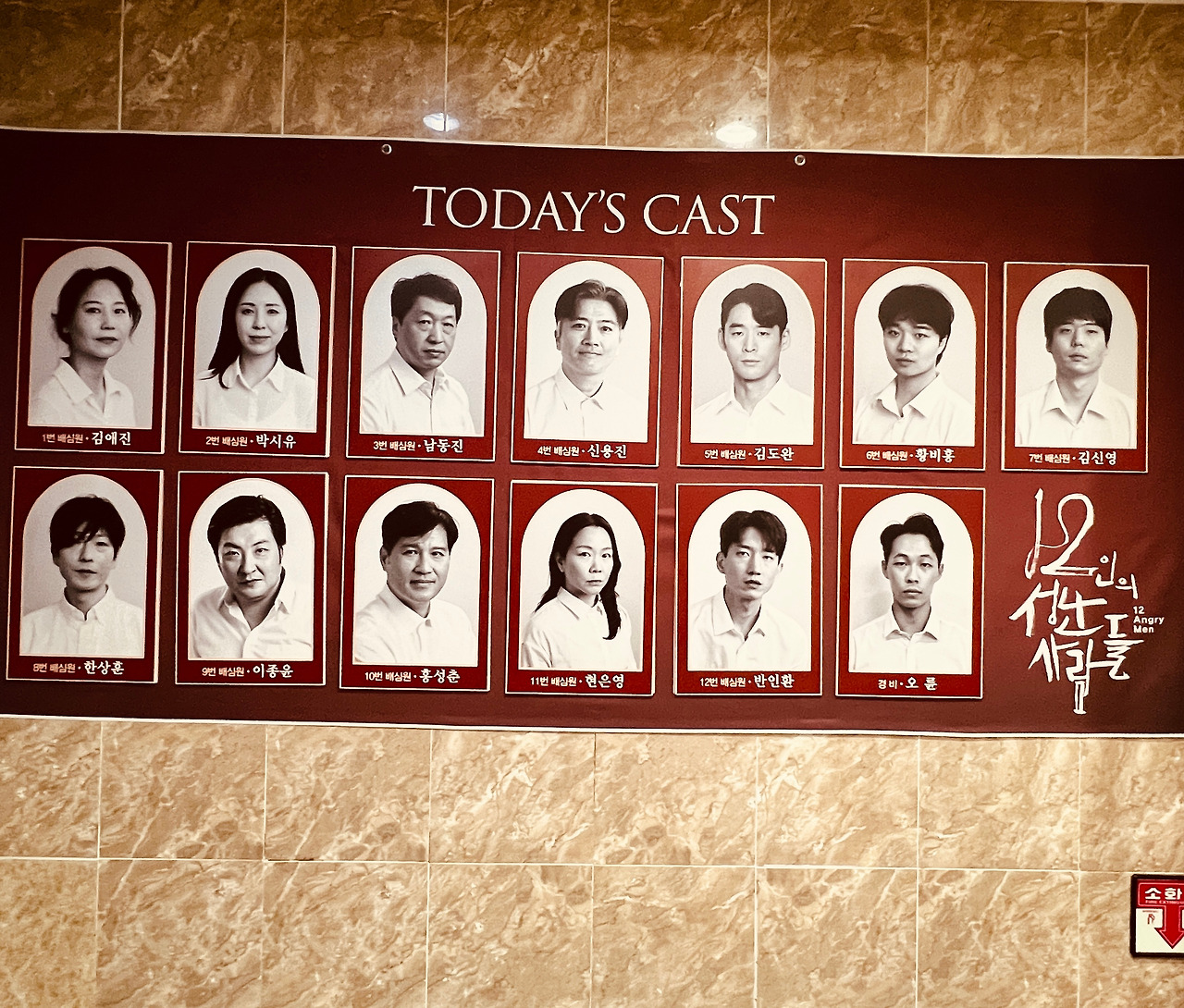 연극은 단 한 번의 무대 이동도 없이 오로지 배심원 방 안에서만 진행되므로 배우들의 합이 매우 중요한데, 어제 팀은 그런 걱정이 무색하게 모두 맡은 역할을 성실하고 감동적으로 수행했다(A, B 캐스트 두 팀으로 진행되는데 나는 A팀 공연 관람). 주인공 격인 8번 배심원 역의 한상훈은 다소 큰 키에 지식인적인 면모로 이의를 제기하는 외로운 배심원 역을 잘 해냈으며 8번과는 정반대의 입장에 서 있는 3번 배심원 역 남동진 배우의 열연은 눈이 부셨다. 인간의 선의를 믿지 않고 기성세대의 편견에 젖어 "걔들이 어떤 놈들인데?!"라며 소년을 당장 전기의자로 보내자고 부르짖는 그의 연기는 '저렇게 소리를 지르다 목이 다 쉬어버리는 것 아닐까' 걱정이 될 정도였는데 연극이 끝나고 로비에서 멀쩡한 얼굴로 나타나 인사를 해서 신기했다.