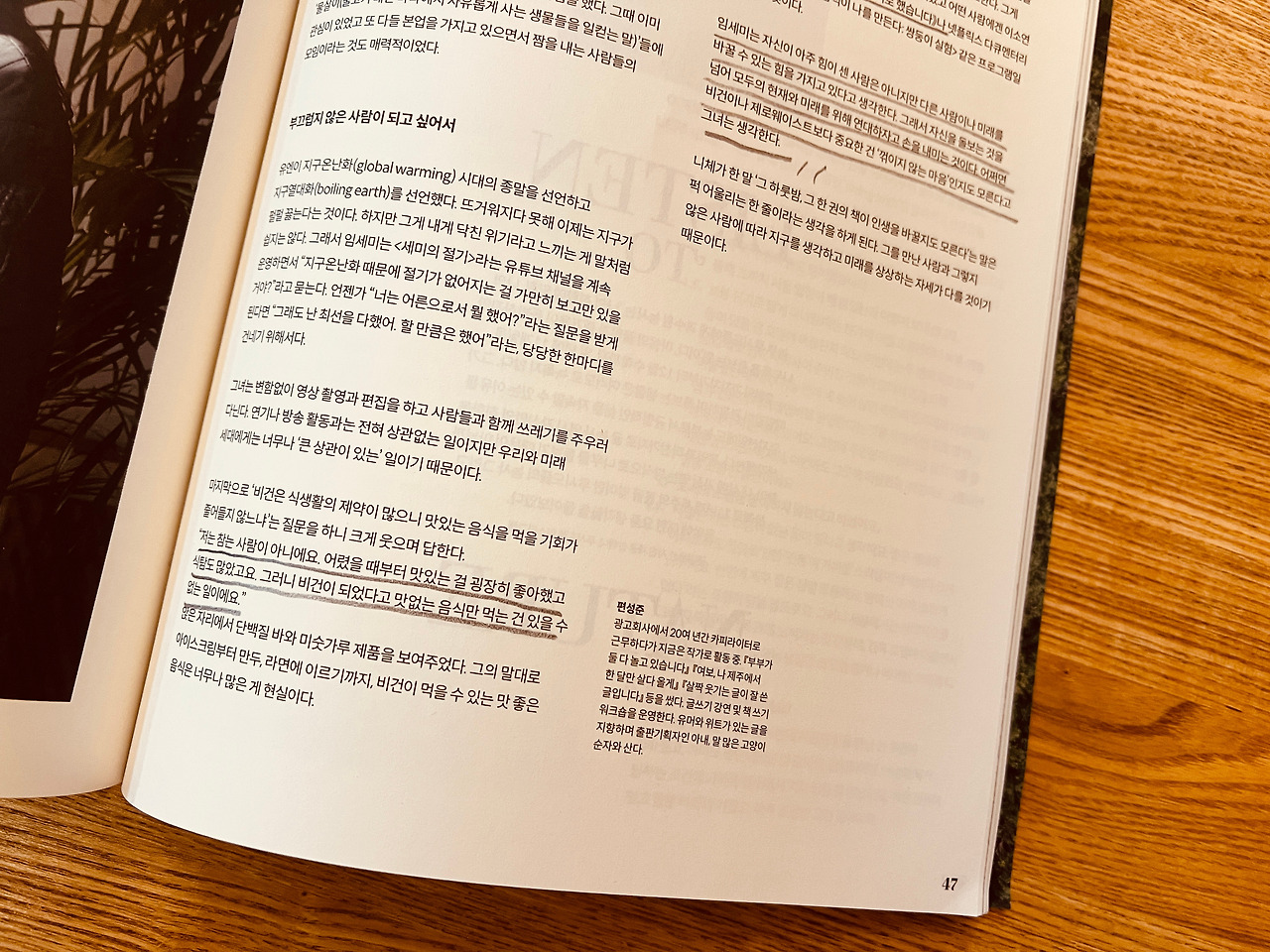 집으로 도착한 잡지를 읽어보고 책꽂이 앞에 두었는데 오늘 아침에 다시 펴보니 아내 윤혜자가 세미 씨 인터뷰를 읽으며 연필로 줄을 쳐놨더군요. 그래서 사진을 찍고 연필로 밑줄을 그은 부분들만 옮겨 봅니다. 인터뷰 전체를 읽고 싶은 분은 <기후생각매거진 - 제로제로> No.3을 구입하세요. 인터넷 서점에서 구할 수 있습니다.