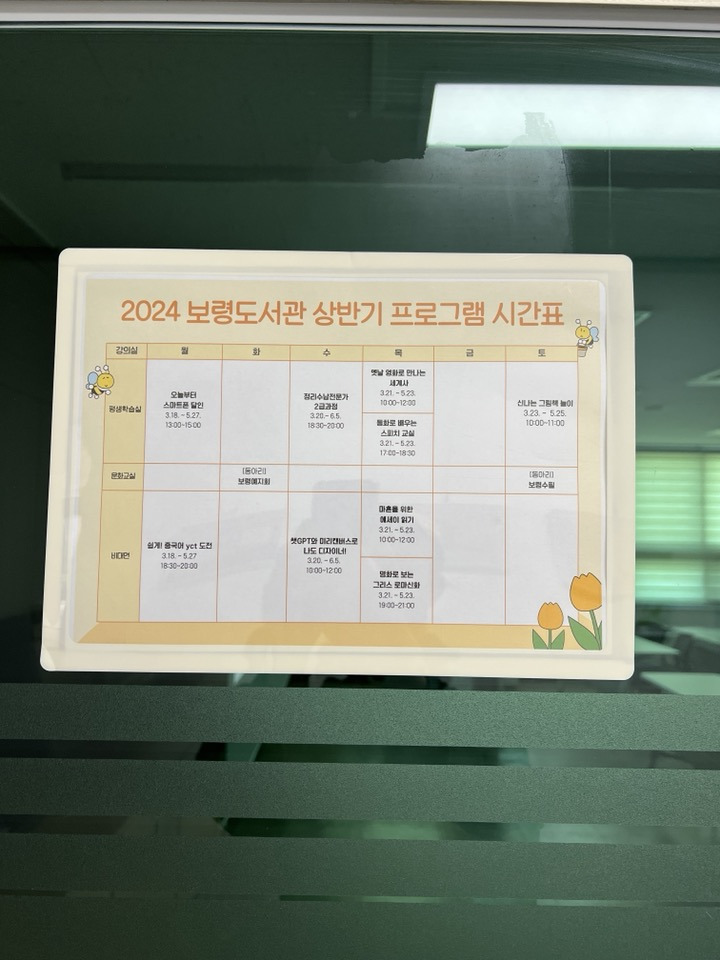 도서관은 아담하고 깨끗한 3층 건물이었다. ‘충청남도보령교육지원청’이라는 수식이 붙어 있는 걸로 봐서 지역 주민을 위해 세금으로 운영되는 기관인 것 같았다. 1층엔 일요일만 제외하고 운영한다는 안내문이 붙어 있고 각 방에선 여러 가지 교육 클래스가 진행 중이었다. 스피커로 영어가 크게 들리길래 가까이 가 보니 ‘영화로 배우는 역사’라는 과목명이 문 앞에 붙어 있었다. 영화 한 편을 보고 강사와 이야기를 나누는 과정 같았다.