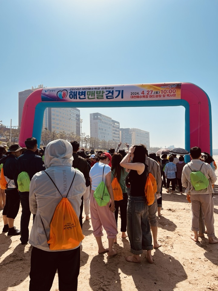 여성 아나운서가 나와 사회를 보았고 간단한 몸 풀기를 한 뒤 참석한 내빈들을 소개했다. 보령시장님이 왔고 국회의원, 시의원, 무슨 무슨 협회 회장들이 나와 인사를 했다. 우리는 눈을 돌려 바다를 바라보며 "와, 대천해수욕장이 이렇게 넓었구나."하고 감탄했다. 이런 행사를 기획한 보령시의 아이디어는 칭찬할 만하다 생각했다. 모래사장은 깨끗해서 맨발로 걸어도 큰 문제가 없을 것 같았다. 보령시에서 미리 나와 위험한 것들을 미리 다 치웠다는 아나운서의 안내 멘트가 있었다.