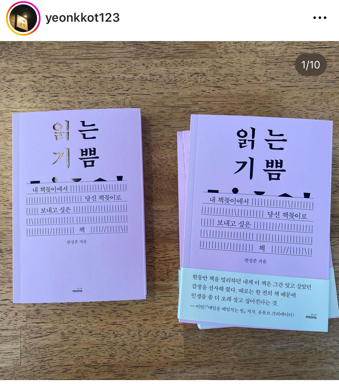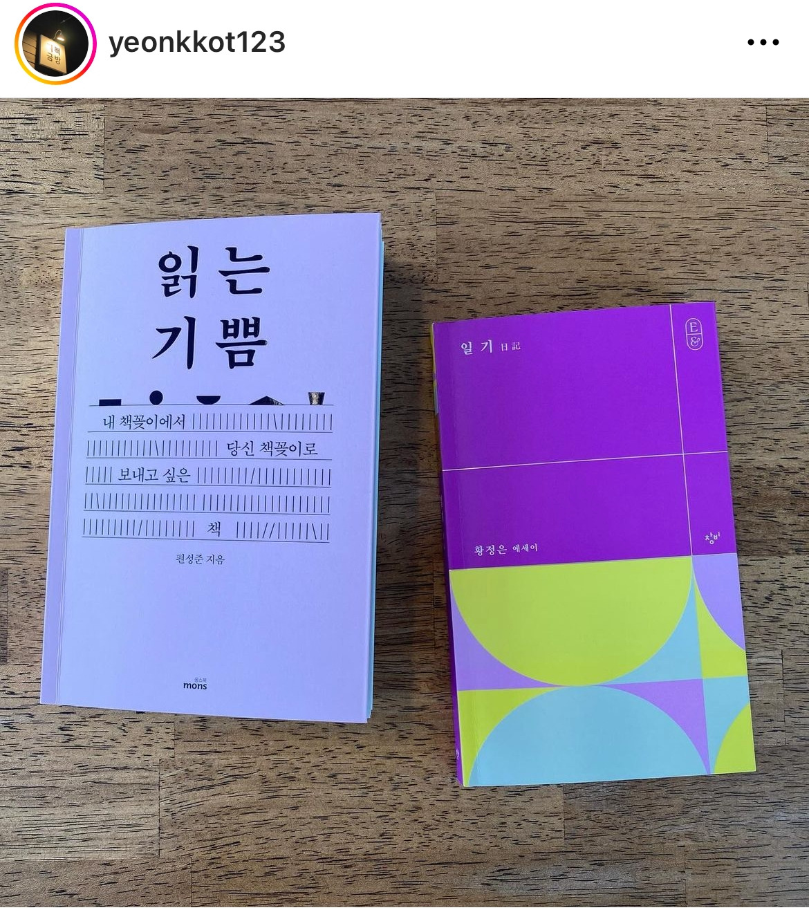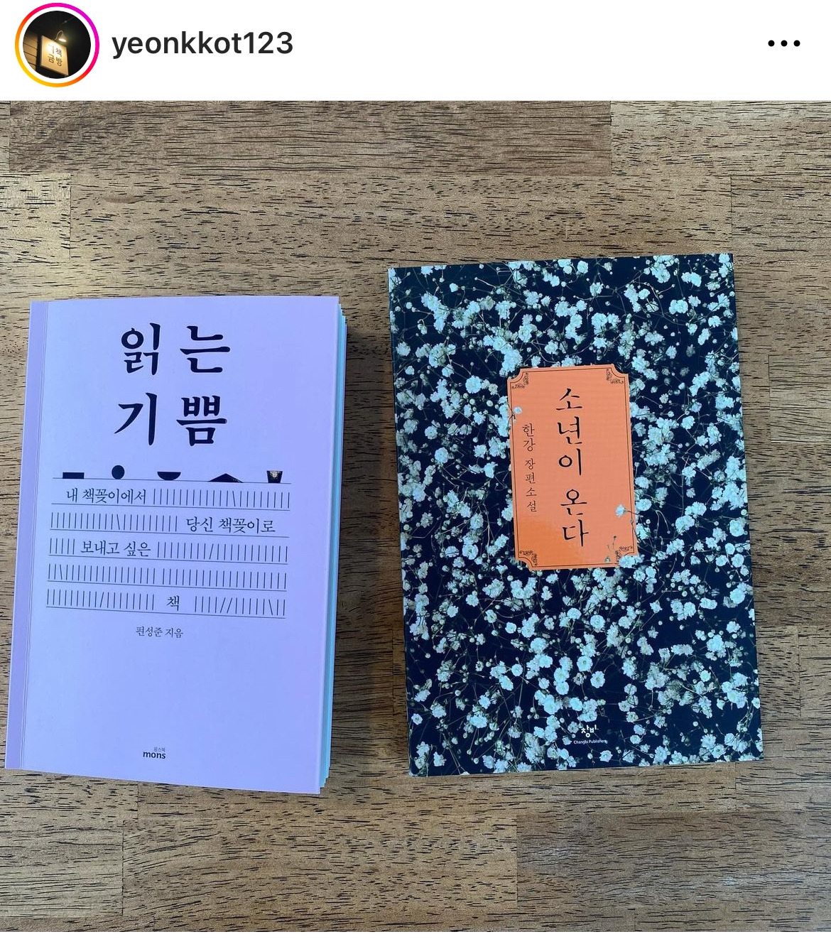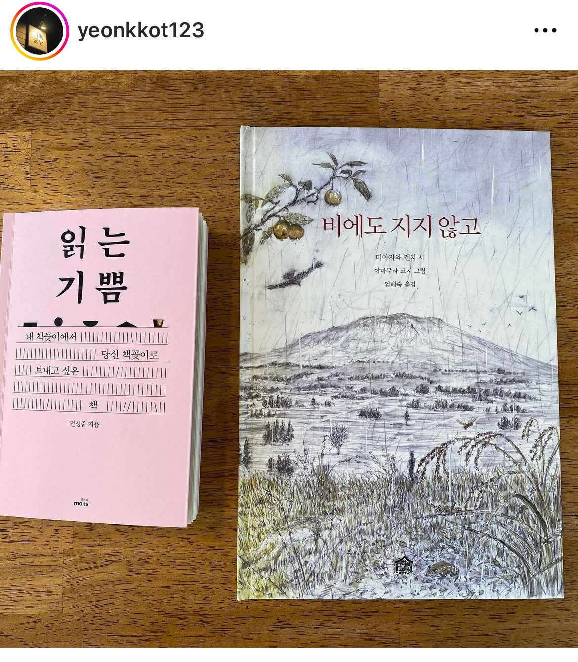 포항 지금책방의 김미연 대표님께서 제 책 『읽는 기쁨』의 리뷰를 써서 인스타그램에 올려 주셨습니다. 리뷰만 써주신 게 아니었습니다. 함께 올라온 사진을 보니 제 책 옆에는 황정은의 『일기』가 놓여 있었습니다. 한강의 『소년이 온다』가 놓여 있었고 다음 장엔 그림책 『비에도 지지 않고』가 함께 놓여 있었습니다. 김 대표는 제가 소개한 첫 챗 『일기』부터 멈췄다고 했습니다. 제가 이 책의 원고를 쓰며 상상했던 이상적인 독자의 모습 그대로였습니다.