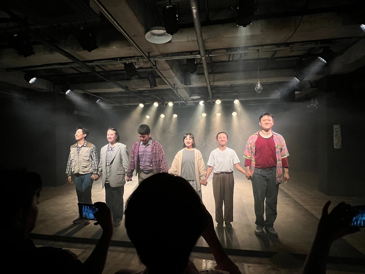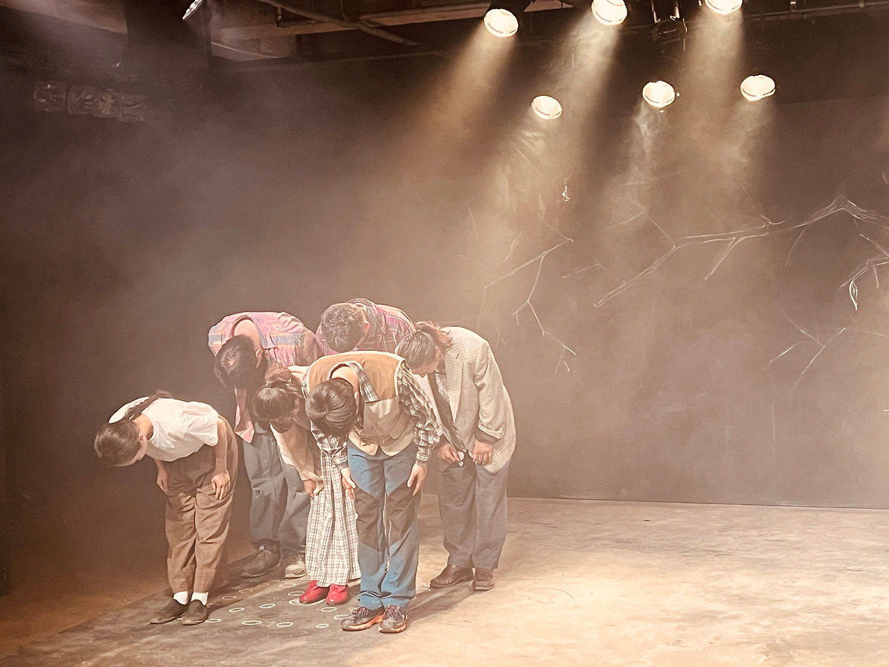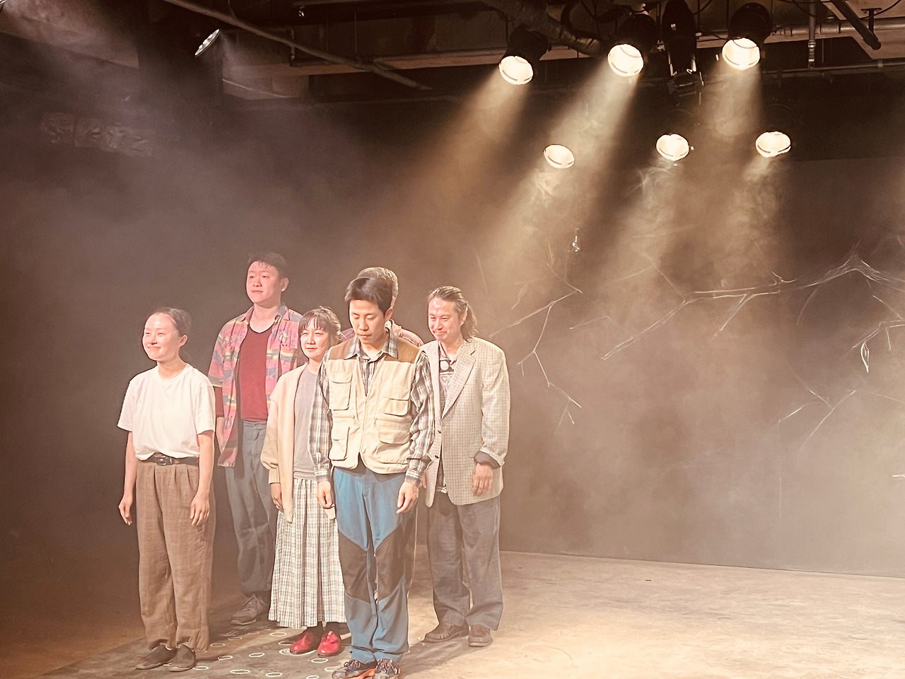 연극이 시작되면 안갯속에서 우울하게 중얼거리며 노래를 하는 배우 다섯 명이 보인다. 뭔가 심각하고 무거운 분위기에 배우들이 정지 화면처럼 서 있으니 타르코프스키의 롱테이크 영화를 보는 것 같다. 그나마 강일 배우나 한철훈 배우가 중심에 서서 진지하게 한 마디 하면 나머지 배우는 그림처럼 굳어서 그냥 서 있다. 특히 윤슬기 배우는 옆모습으로 서서 꼼짝도 안 하고 한참을 서서 극의 긴장감을 더한다.