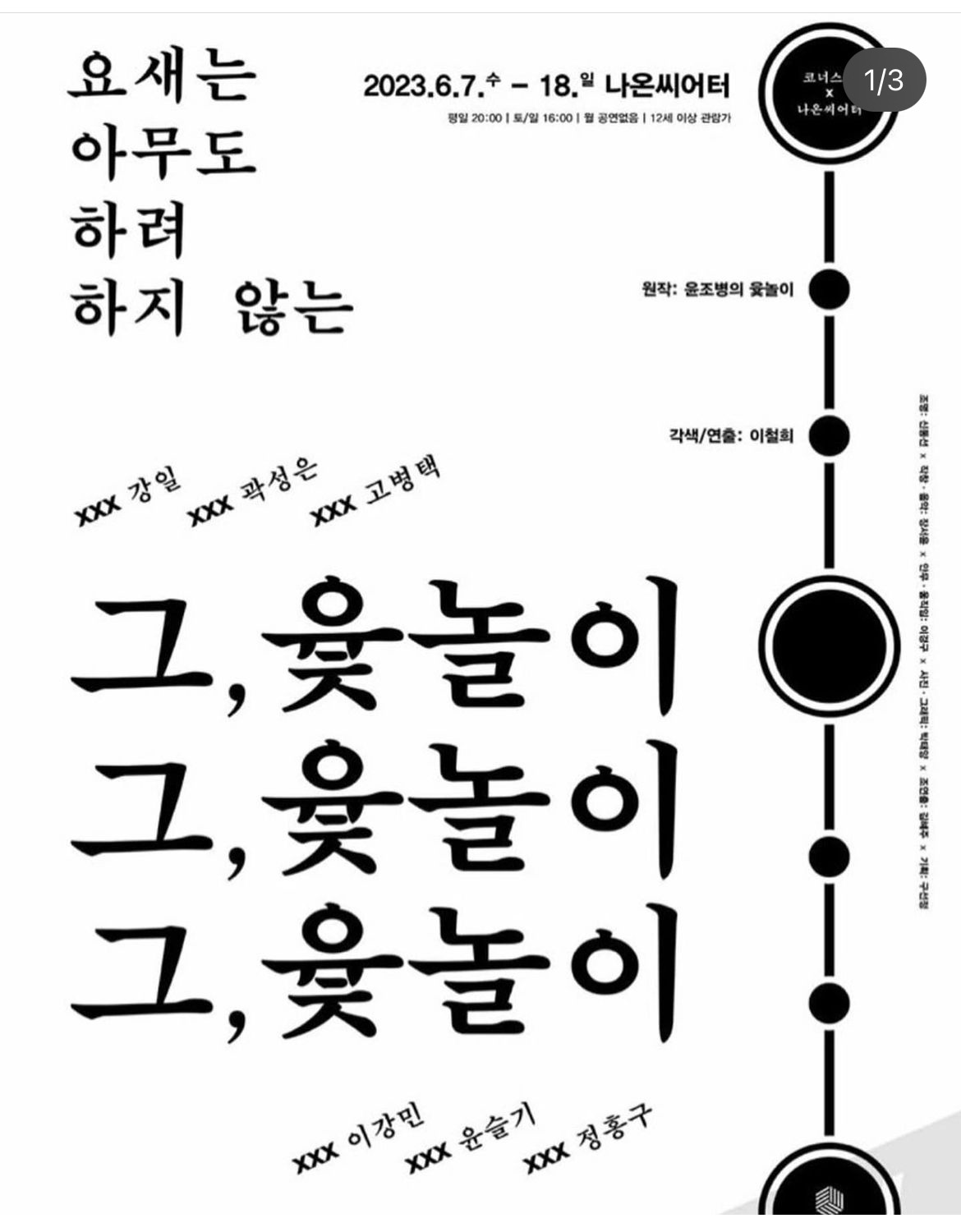 이 작품은 윤조병 작가의 희곡을 원작으로 삼았다는데 윷놀이라는 게임의 상징성을 잘 살린 연출과 배우들의 연기가 어우러져 깔끔한 뒷맛을 남겼다. 연극을 다 보고 나오다가 객석에서 페친이라고 인사를 하신 이희문 선생과 잠깐 이야기를 나누었다. 서로 아는 사이인데 실제 얼굴을 보는 건 처음이었다. 박규옥 선생과 동문이라고 하신다. 조선희 선생이 하는 '책읽는고양이' 북토크 때 오실 거라고 하시길래 그때 뵙자고 인사를 하고 헤어졌다. 2024년 6월 2일까지 여행자 극장에서 상연한다. 인터파크에서 예매해도 되고 극장 현매도 가능하다.