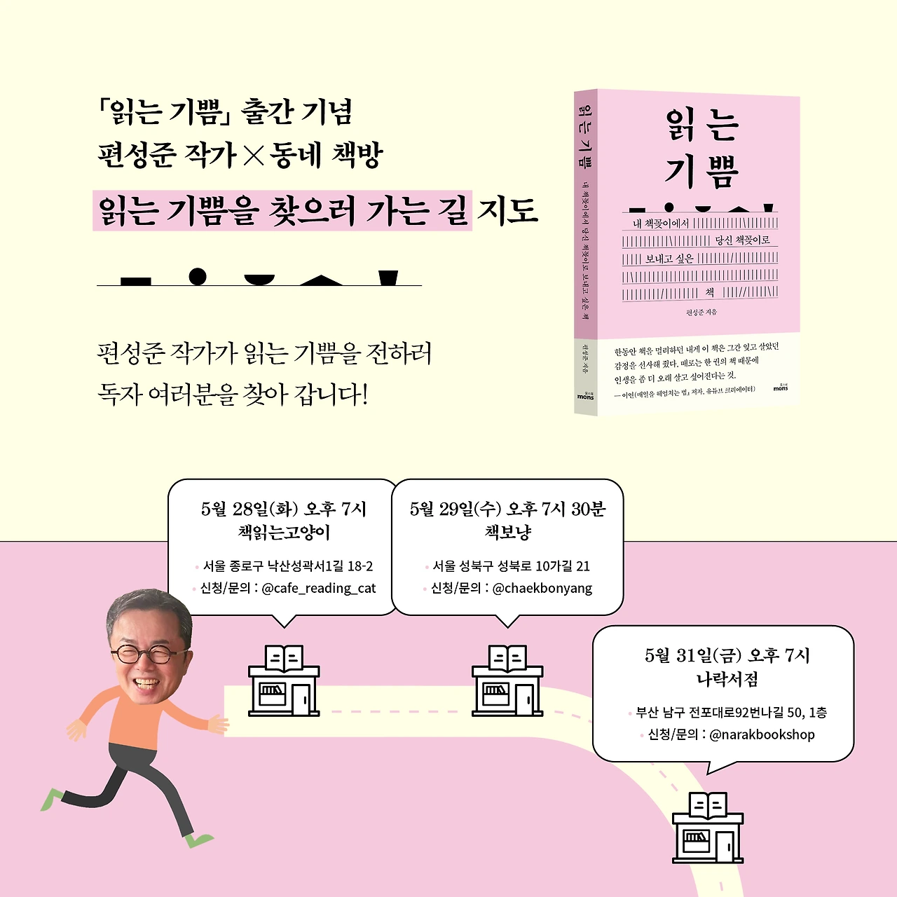 편성준이 ‘내 책꽂이에서 당신의 책꽂이로 보내고 싶은 책’들을 진심으로 골라 큐레이션 한 책 『읽는 기쁨』 의 북토크가 6월에 집중적으로 펼쳐집니다.
