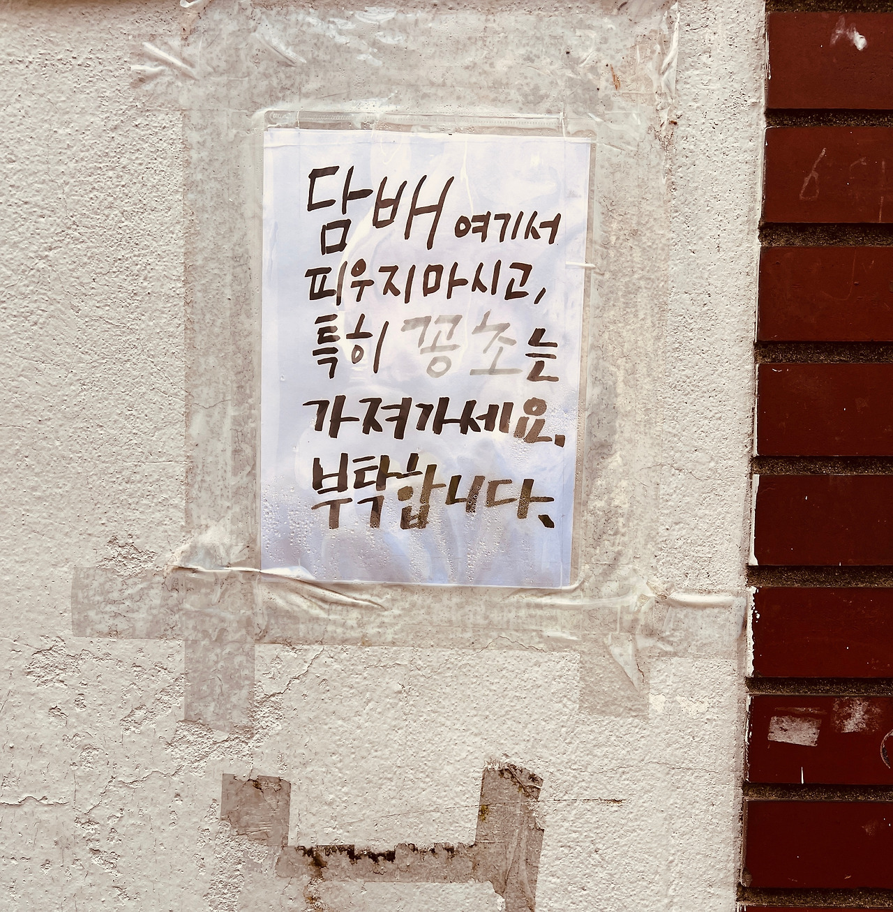 하도 골목 삼거리에 담배꽁초를 버리는 사람이 많아서 경고문을 써붙이기를 몇 번 하다가 얼마 전엔 A4지 꽂는 클리어 파일 안에 경고문을 넣어 스카치테이프로 단단히 붙였더니 비가 와도 걱정이 없다. 다만 경고문을 무시하고 호시탐탐 담배꽁초를 버리는 사람들이 있어서 걱정이다.