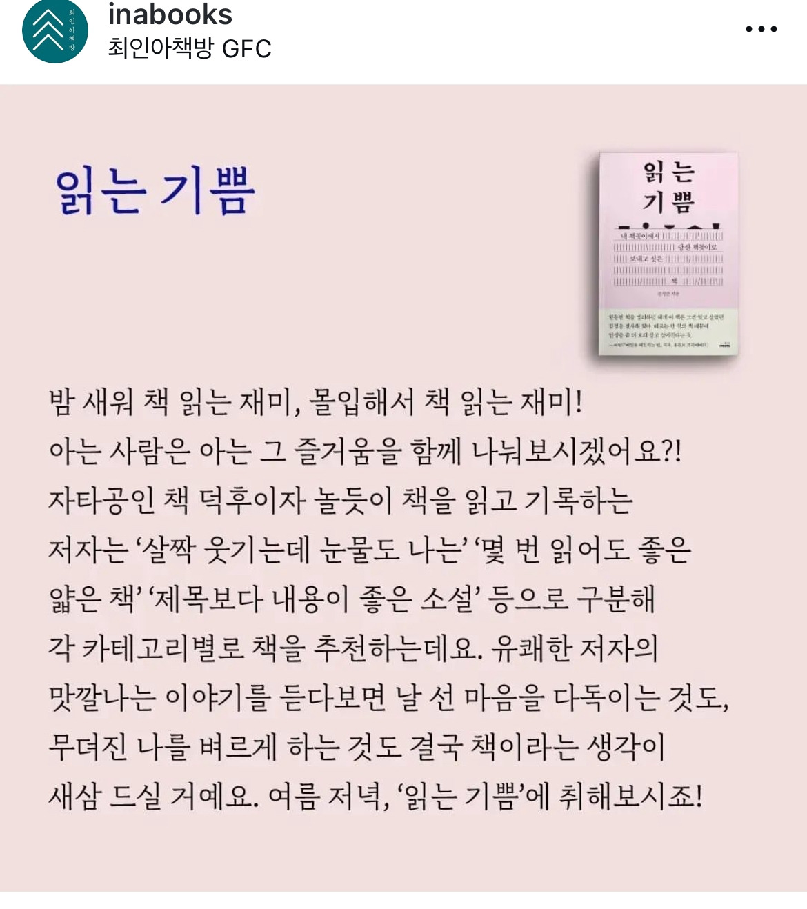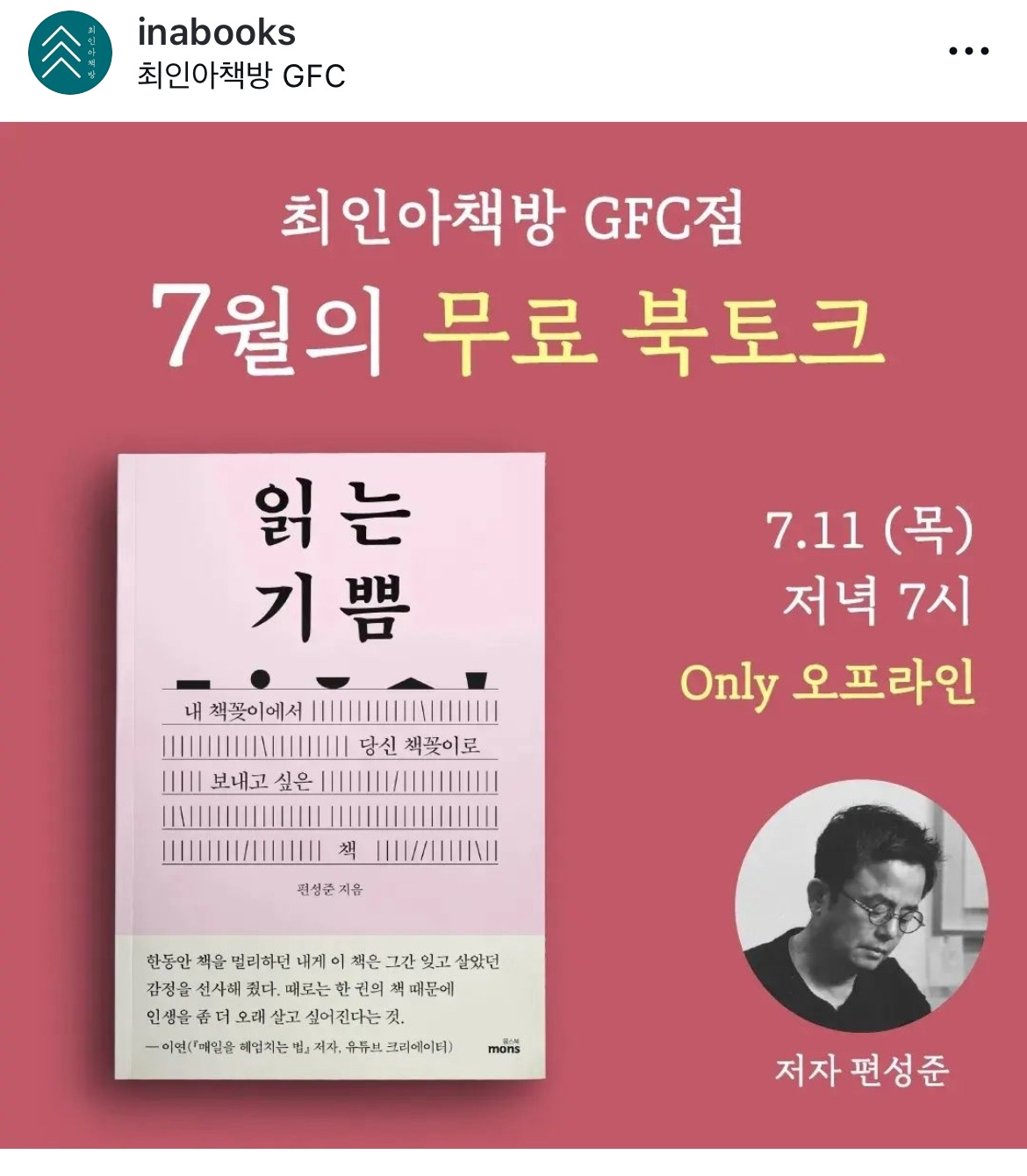 사람의 이름을 딴 건물이나 기업의 사례는 세계 곳곳에서 쉽게 찾아볼 수 있죠. 뉴욕의 케네디공항과 링컨센터뿐만 아니라, 조지 워싱턴대학교, 레오나르도 다 빈치공항, 그리고 존스 홉킨스 병원 등이 그렇습니다. 이처럼 이름을 딴 건물이나 기업은 그 인물의 업적과 영향력을 기리며 기억하려는 목적을 가집니다. 방금 언급한 경우들만큼 크진 않지만 전직 광고인의 이름을 넣은 최인아책방 역시 단순히 책을 파는 공간을 넘어 최인아라는 인물의 철학과 열정이 깃든 문화공간입니다. 더구나 제일기획에서 카피라이터로 시작해 그 회사 부사장까지 역임한 최인아 대표가 광고나 컨설팅 회사가 아닌 책방 운영을 택했다는 건 다른 일로 옮겨간 게 아니라 그동안의 업에서 책이라는 종목으로 그 정신의 폭을 넓혀 간 것이기에 더 가치 있는 발걸음이었습니다. 운 좋게도 지난 목요일 저녁에 저는 최인아책방GFC점에서 제 책 『읽는 기쁨』의 북토크를 했습니다.