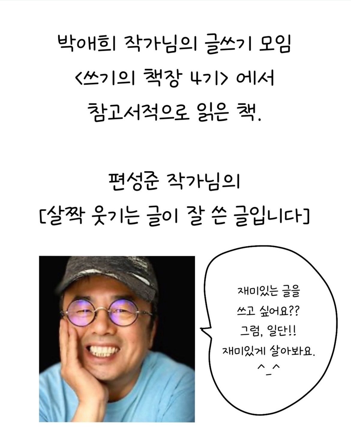 며칠 사이 인스타그램에서 이상하고 신기한 일이 일어났다. 내 책 『살짝 웃기는 글이 잘 쓴 글입니다』가 자꾸 피드에 올라오는 것이었다. 그냥 사진만 올라오는 게 아니라 내 책을 들고 춤을 추는 여성의 동영상까지 등장했다. 이게 어찌 된 일일까 알아보니 <쓰기의 책장>이라는 온라인 글쓰기 챌린지를 운영하는 박애희 작가의 책 선정 덕분이었다.