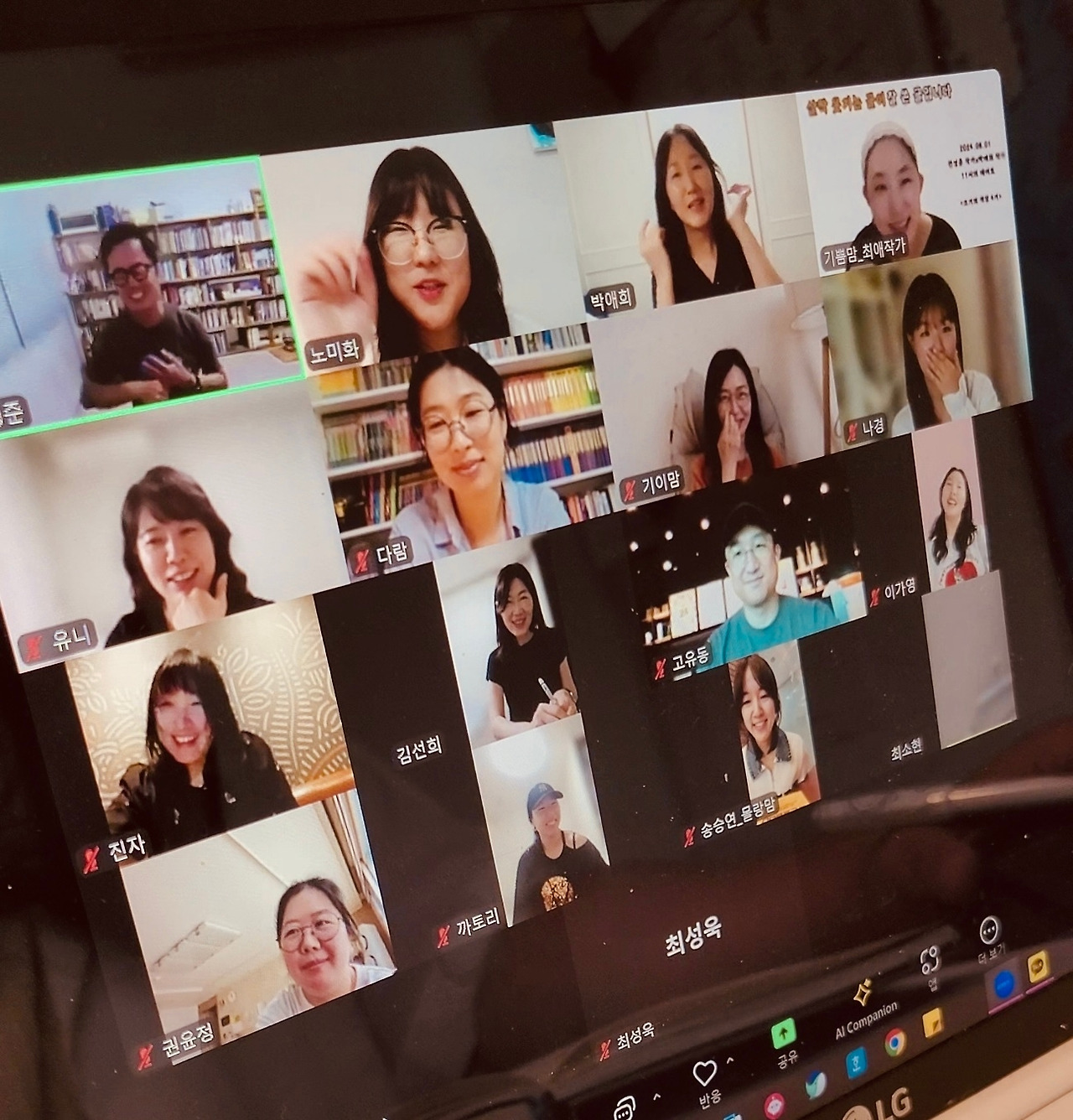나는 너무 놀라고 고마워서 박 작가에게 당장 인스타그램 메시지를 보냈다. 스무 명이나 모여 한 달 내내 내 책을 읽고 있었다는 사실이 너무 놀랍다. 고마워서 그러니 회원들을 한 번 만나 인사라도 전하게 해 달라. 온라인으로만 만나고 아직 서로 얼굴도 못 봤다고? 잘 됐다. 마침 내게 줌 계정이 있으니 가까운 시일 내에 미팅을 한 번 갖도록 하자. 그렇게 해서 2024년 8월 1일 목요일 오전 11시에 '쓰기의 책장' 멤버들과 이달의 책 작가가 만나는 줌 미팅이 이루어졌다.
