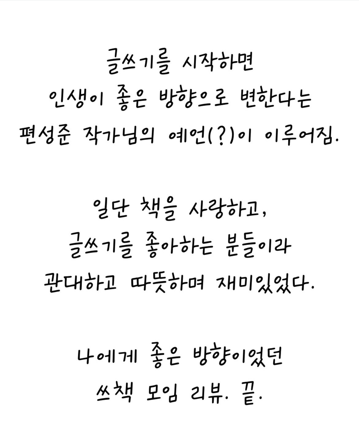 쓰기의 책장 회원들은 서로 '쓰님'이라는 명칭을 스고 있었다. 나는 쓰님들을 만나기 전 그들의 인스타그램 피드애 들어가 내 책에 대해 쓴 글들을 읽어 보았는데 "한 마디로 수작이다"라는 평은 기뻐서 여러 번을 읽고 또 읽었다. 줌을 통해 만난 회원들은 난리가 났다. 나는 물론 다른 분들과도 얼굴을 대하는 건 처음이라는 것이었다. 내 책을 들고 춤을 춘 몰랑맘 승연 님은 춤을 배운 지 한 달밖에 되지 않았지만 스스로를 '춤추는 북스타그래머'로 규정하고 있었다. 글쓰기는 하고 싶은데 합평이 무서워 망설이다가 여기 오게 되었다는 나경 님, 우울증을 앓았는데 글쓰기를 한 후 많이 개선되었다는 소현 님, 글쓰기는 질색이었는데 선착순이라는 말에 승부욕이 발동해 들어왔다는 진자 님, 인스타툰을 그리는 기이맘 님 등 저마다의 스토리를 가진 멋진 분들이 한 자리에 모였다.