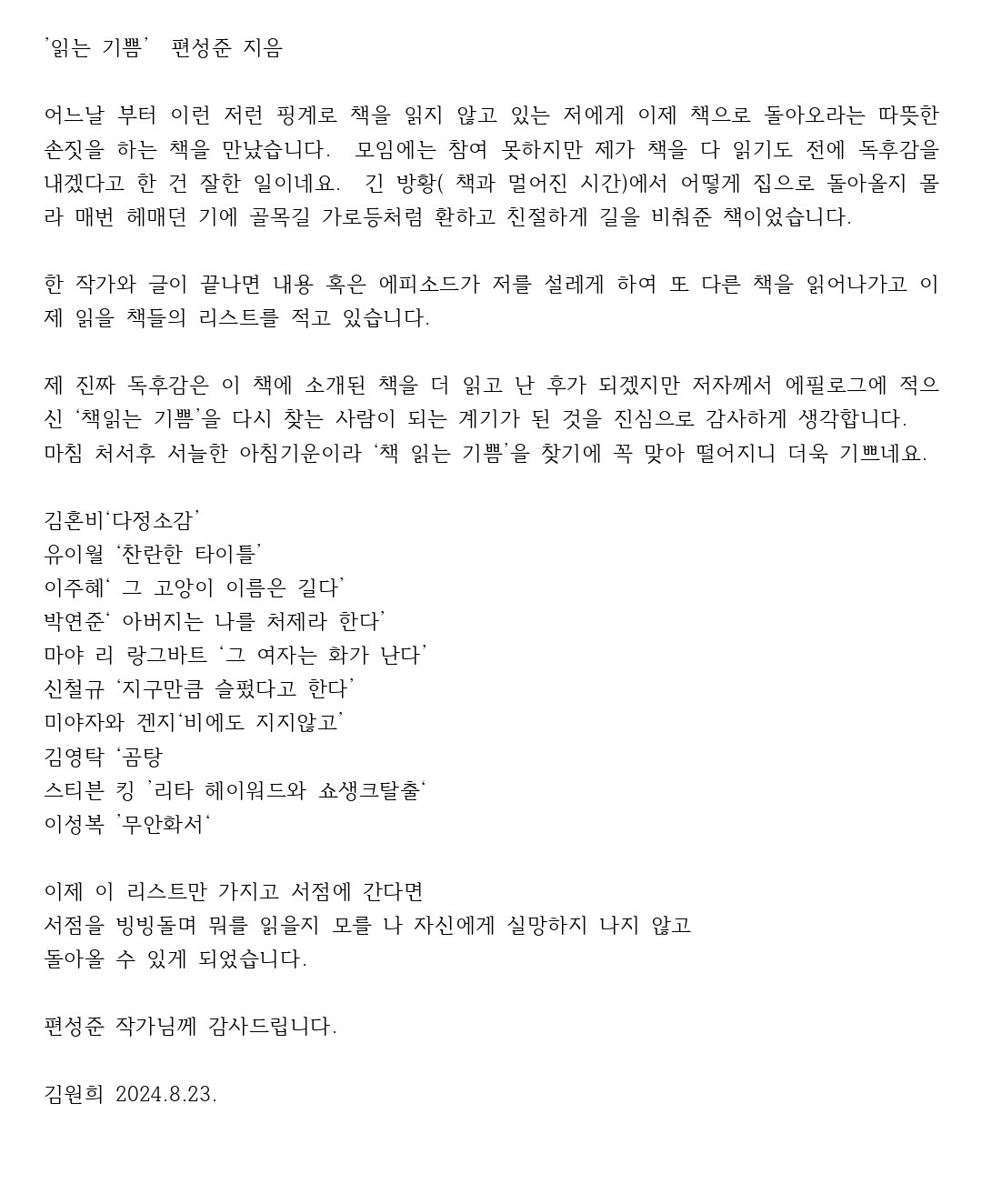 모임 멤버지만 참석을 못 하신 김원희 선생이 책 리뷰를 보내 주셨다. 독서를 게을리하고 있는 자신에게 내 책이 골목길을 비추고 있는 가로등 같은 존재였다는 고마운 글이었다. 한 시간 반의 행사가 모두 끝나고 동네에 있는 이탈리안 레스토랑 '아삐에디'에 가서 스파게티와 피자를 먹었고 단골 커프숍인 '킵업커피'에 가서 커피를 산 뒤 집으로 다시 올라왔다. 나는 원고를 쓸 게 있어서 먼저 인사를 드리고 나왔다. 성화숙 선생이 집에 있던 시바스 리걸 12년 산 위스키와 금일봉을 챙겨 주셔서 사양하지 않고 받아 나왔다. 날씨가 너무 덥고 가방은 무거웠지만 마음만은 가벼운 금요일 오후였다.