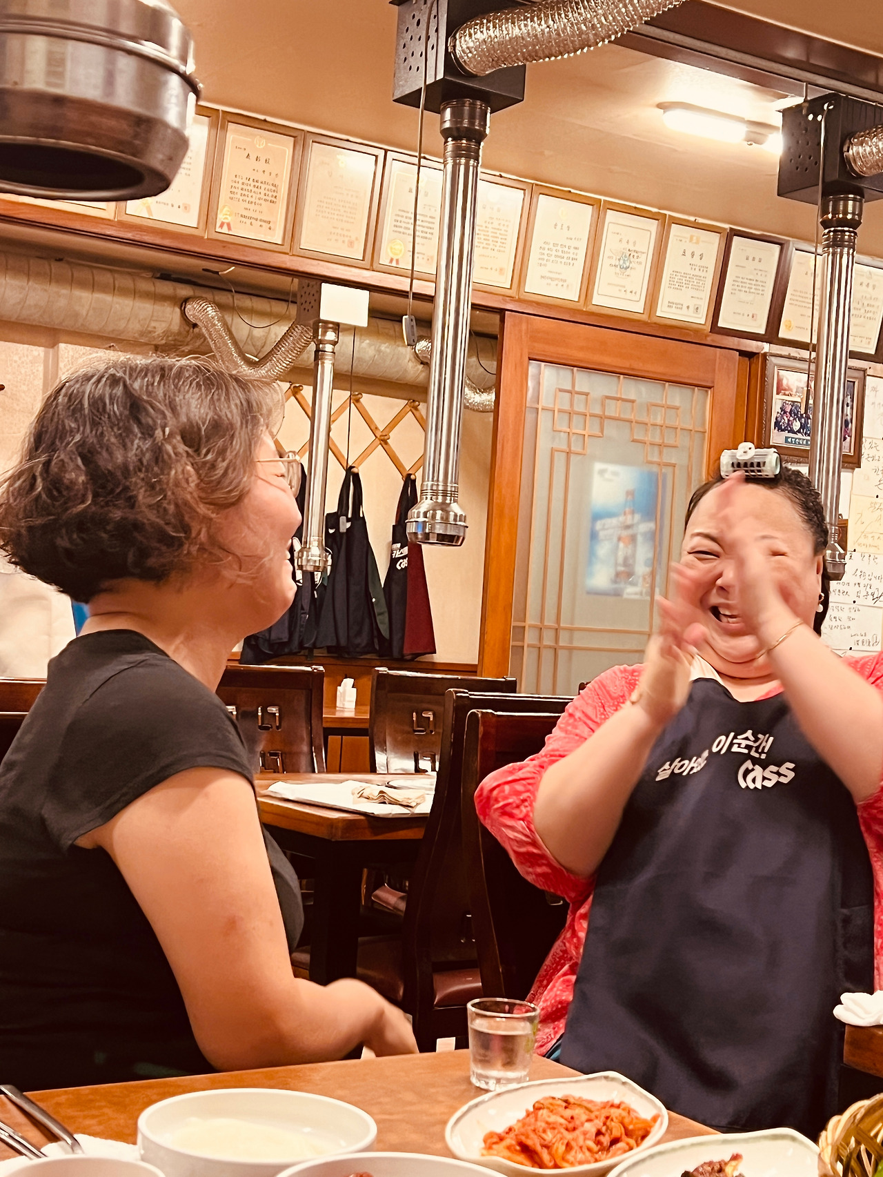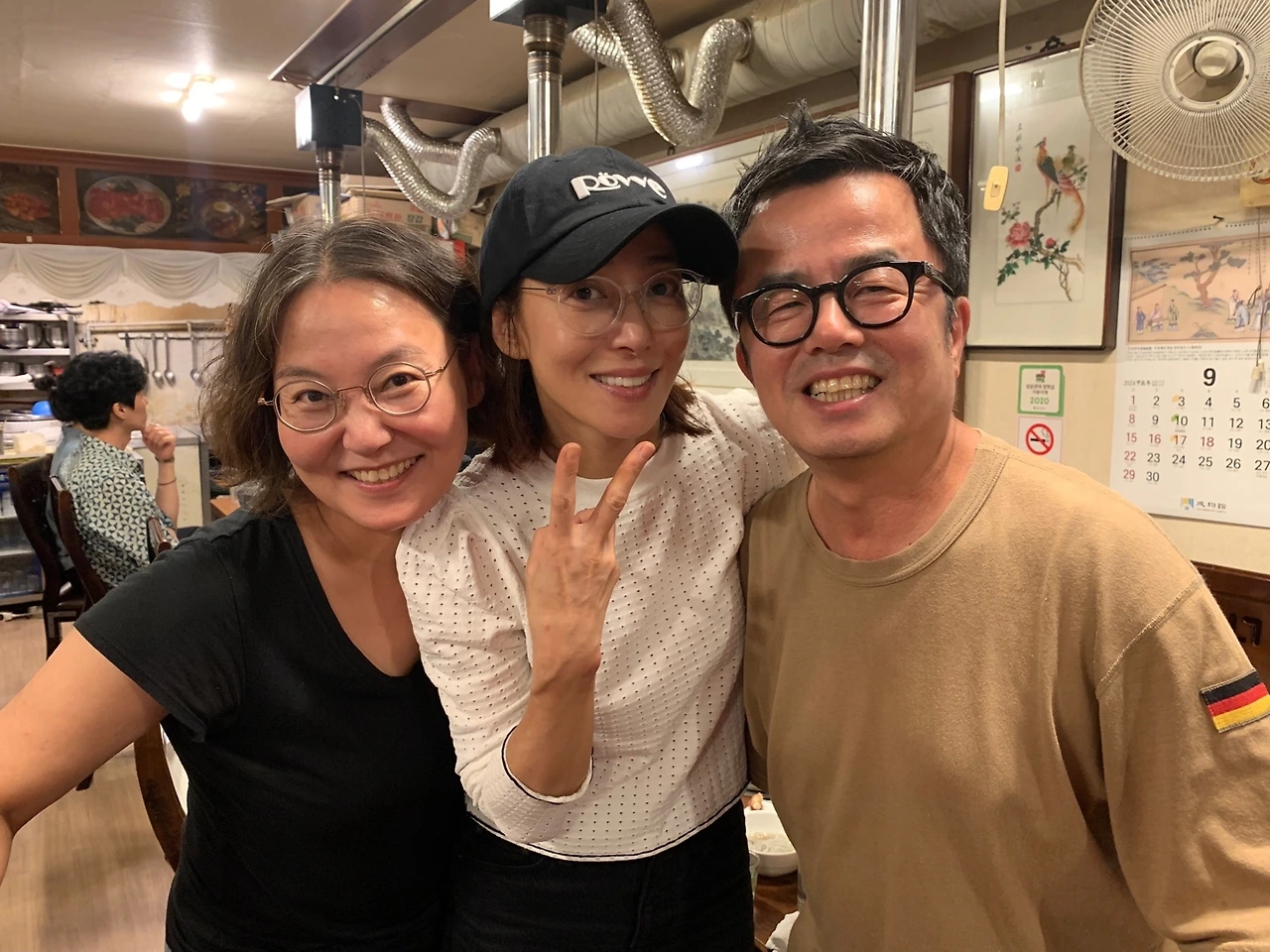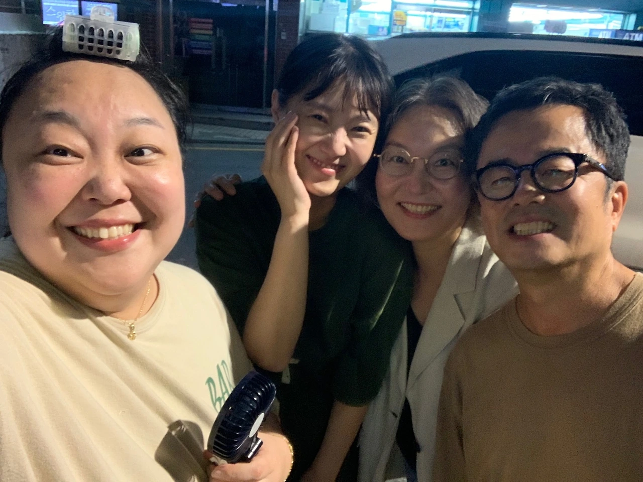 마지막 공연날이었기에 배우와 스태프들이 회포를 푸는 삼겹살 회식에 우리도 합류해 술을 마실 수 있었다. 극단 대표를 맡고 있는 이호열 배우와 박소연 배우, 안소영 배우 등이 기꺼이 아내와 나를 초대해 준 덕분이다. 개인적 사정으로 참석하지 못한 박근형 대표를 제외한 프로젝트 인원 모두가 술잔을 높이 들며 그동안의 노고를 서로 치하하고 격려했다. 이번엔 조연출을 맡은 최유리 배우와도 인사를 나누었다. 아내가 이호열 배우는 점점 잘생겨지는 것 같다고 했더니 자신은 십여 년 전부터 꽃미남이었다고 대답해 좌중을 웃겼다. 장영남 배우는 내가 오래전부터 팬이었다는 아내의 얘기를 듣고 같이 반갑게 대화를 한 후 기념사진을 찍기도 했다. 사진은 박소연 배우가 찍어 주었다.