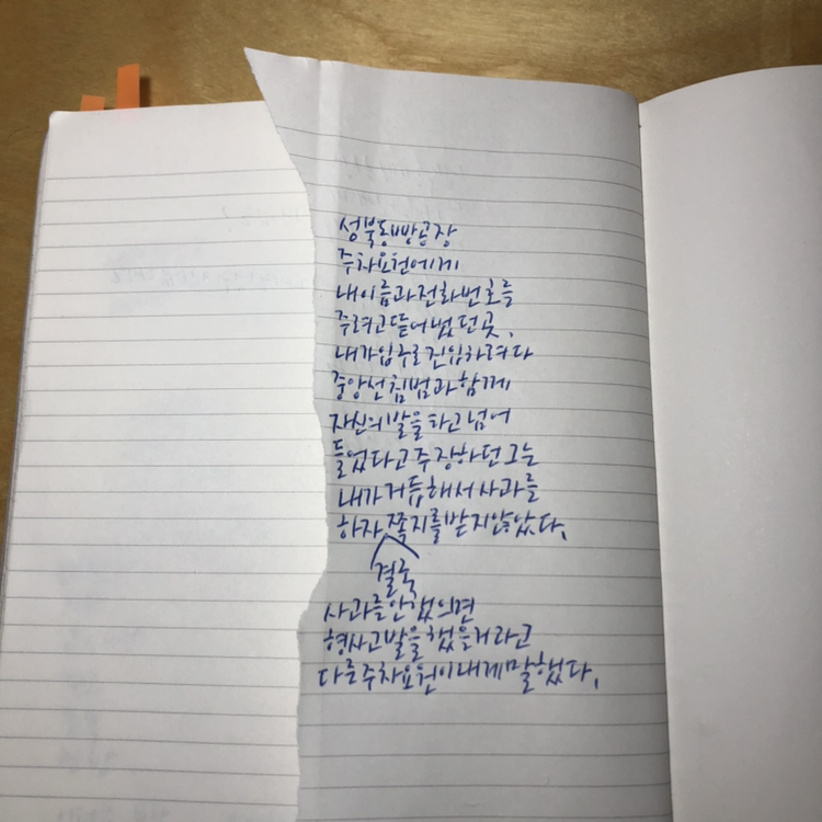 아내가 보험회사에 전화를 하는 동안에 나는 주차요원들과 얘기를 했다. 다른 주차요원이 와서 작은 소리로 일단 사과를 하라는 말만 반복했다. 안 그러면 진짜 경찰을 부를지도 모르고 또 그냥 다쳤다고 주저앉으면 정말 골치 아파진다는 것이었다. 이쯤 되면 주차요원들끼리 짜고 '굿캅 배드캅' 놀이를 하고 있는 게 분명했지만 할 수 없었다. 회사를 그만 둬서 명함이 없는 나는 가방에 있던 노트를 찢어 이름과 전화번호, 주소를 적어 주차요원에게 주었지만 받지 않았다