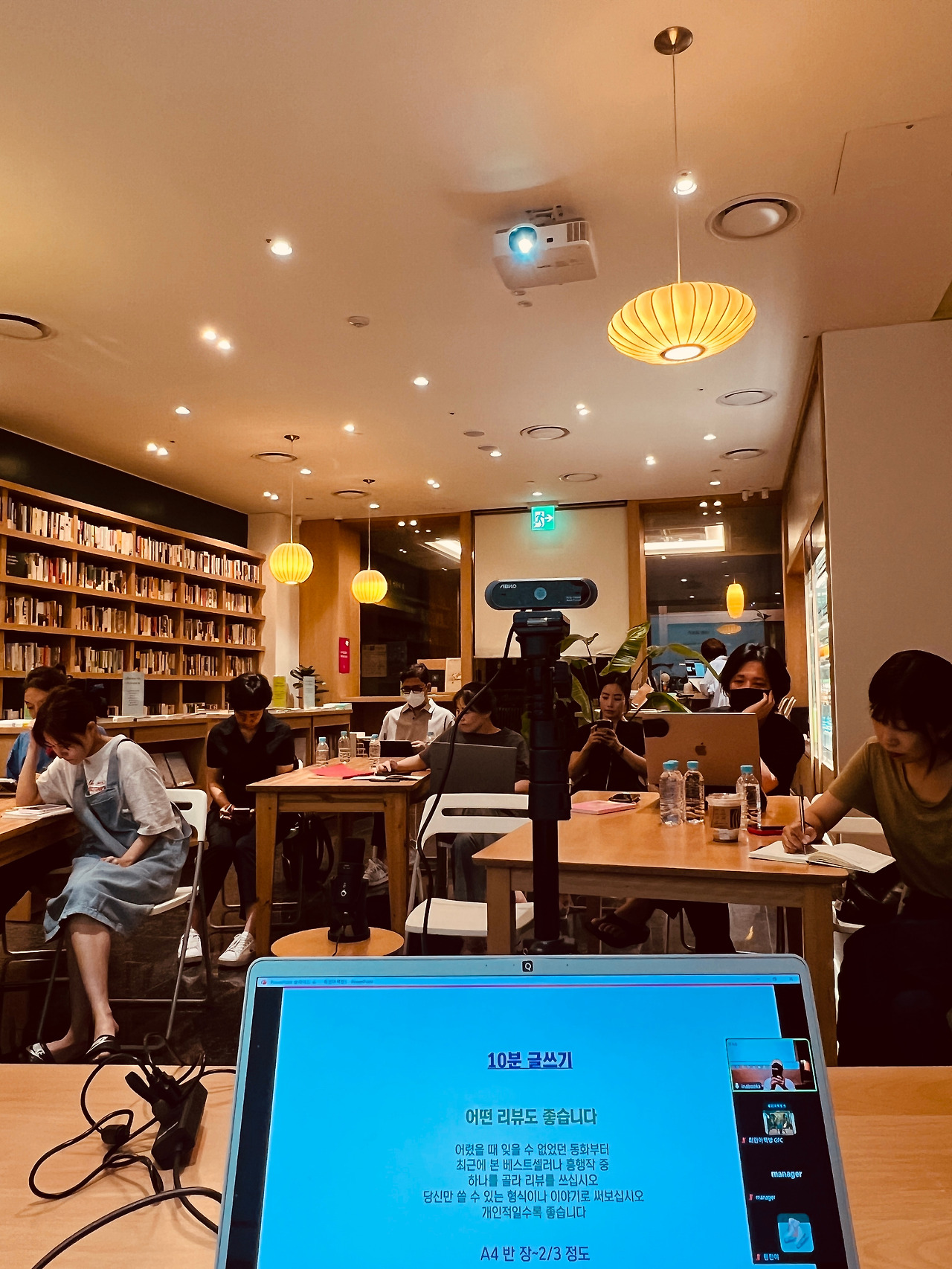 사진을 찍으며 여행을 하는 남성이 오셨고 유치원교사로 일하며 소설가를 꿈꾸는 여성도 오셨다. 광고대행사 직원, 고등학교 음악교사, 금융권에서 올 일하다 건강 때문에 퇴직한 분도 있었고 딸이 중3인데 극심한 사춘기라 힘들어하다가 엄마가 글을 써 보면 어떨까, 하는 생각으로 오신 분도 있었다. 돈암동에 사는 분은 아리랑도서관 특강 때 본 나를 다시 찾아왔다고 했다. 최인아책방 근처에 살지만 그 시간에 늘 아이를 돌보느라 줌으로만 참여하는 분이 있었고 이런저런 책 모임을 하는 분도 몇 분 있었다. 이렇게 다양한 분들이 매주 목요일 저녁이면 열 일 제쳐두고 최인아책방에 와서 함께 앉아 있다는 게 놀라웠다.