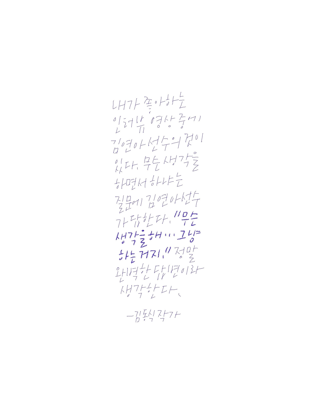 내가 좋아하는 인터뷰 영상 중에 김연아 선수의 것이 있다. 무슨 생각을 하면서 하느냐는 질문에 김연아 선수가 답한다. "무슨 생각을 해... 그냥 하는 거지." 정말 완벽한 답변이라 생각한다. 어떤 사람들은 출근길에 작은 눈사람이 쓰러져 있는 걸 보면 그냥 일으켜 세우고 지나간다. 아무 이유 없다. 그냥 아무 생각 없이 세우는 거다. 기찻길 선로 위로 추락한 사람을 구하려고 뛰어든 영웅들을 인터뷰하면 하나같이 똑같은 말이 나온다. 그냥 몸이 움직였다고. 난 인간의 위대한 점이 바로 이런 '그냥'에 있다고 생각한다. 생각하고, 고민하고, 안 할 이유를 찾고 할 시간에 그냥 해버리는 것 말이다.
