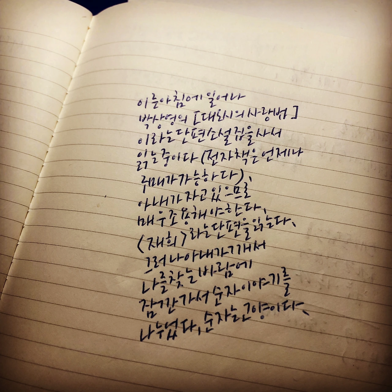이른 아침에 일어나 박상영의 [대도시의 사랑법]이라는 단편소설집을 사서 읽는 중이다(전자책은 언제나 구매가 가능하다). 아내가 자고 있으므로 매우 조용히 해야한다. <재희>라는 단편을 읽는다. 그러나 아내가 깨서 나를 찾는 바람에 잠깐 가서 순자 이야기를 나누었다. 순자는 고양이다.