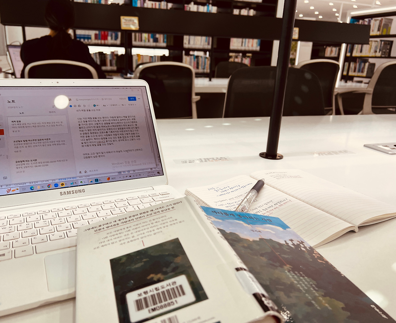 머릿속으로만 생각을 굴리고 좀처럼 꺼내지 않는 사람들이 있다. 천재들은 이런 식으로 어느 날 툭, 하고 굉장한 것을 내놓기도 한다. 하지만 천재보다 둔재에 가까운 나는 작은 실마리 하나라도 생기면 그걸 붙잡고 씨름해야 뭔가 이야깃거리로 발전시킬 수 있다. 가만히 있다가 멋지게 짠, 하고 내놓는 건 나로서는 사실상 불가능한 일이다. 그래서 좋은 글이든 싱거운 글이든 매일 쓰려고 노력한다. 그 어떤 기획이나 프로젝트도 단번에 완성되는 건 없다. 기억의 축적이 필요하고 증거가 있어야 인정을 받을 수 있다. 내가 '매일 글을 쓰는 이유'는 바로 이런 생각과 마음에서다. 이 글도 보령시립도서관에 와서 저녁에 있을 책쓰기 워크숍 특별 리뷰를 준비하다가 문득 생각나서, 잊지 않으려고 쓰게 된 글이다.