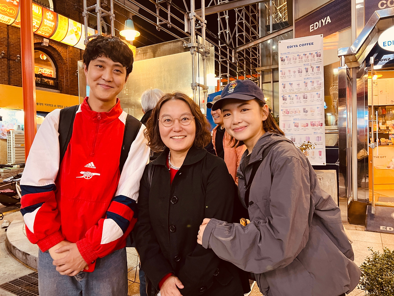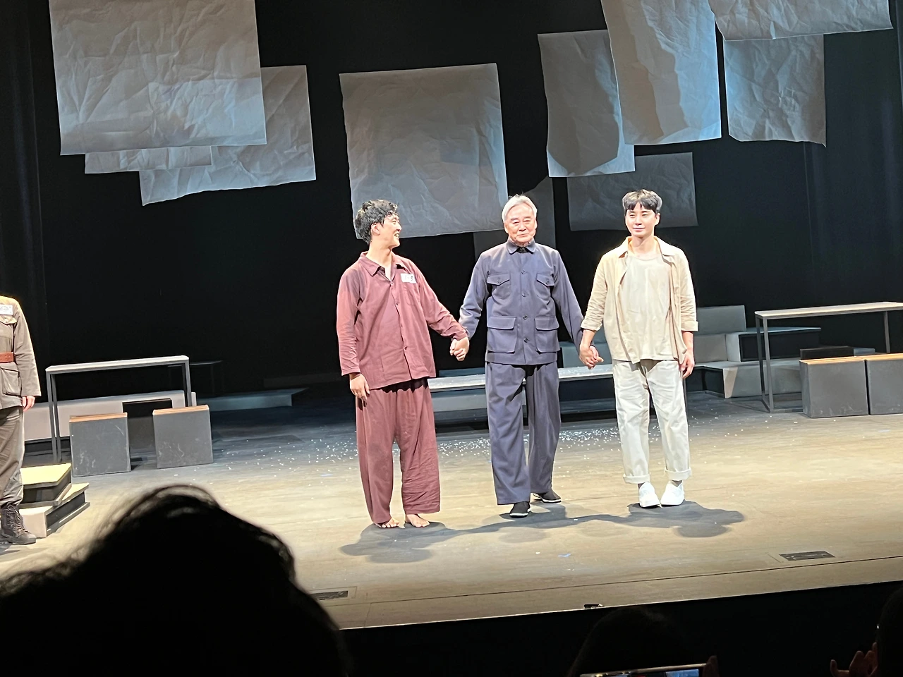 이 연극은 2019년 아르코 예술창작실험활동이 일환이었습니다. 정확한 고증과 스터디를 위해 중국은 연길-북경-석가장-태항산-호가장을, 일본은 나가사키-이사하야-도쿄를 리서치했답니다. 이런 과정을 거쳐 5년 만에 비로소 무대에 올리게 되었다고 하니 그 열정과 집념이 대단합니다. 게다가 출연하는 배우들의 면면은 또 어떻고요. 한 사람의 일대기를 모두 다룬 다큐멘터리 연극인 만큼 소년부터 노년까지 세 배우가 김학철 역을 맡았는데 남명렬, 김세환, 김시유라는 명배우들이 출연합니다. 특히 노년의 김학철 역을 맡은 남명렬 배우는 그 당시는 물론 다른 시간대까지 아우르는 '메타인지' 캐릭터로 극의 흐름을 잡아주고 있습니다. 김재엽 연출의 작품에서 늘 볼 수 있는 백운철, 서정식, 이갑선, 이다혜, 이소영, 이태하, 장찬호, 정유미 배우 들이 출연해 일인다역을 소화했고요. 로비에서 만난 김재엽 연출은 "이번 연극은 제가 좋아하는 배우들을 한 곳에 모두 모아서 함께 한다는 즐거움 또한 큽니다"라고 말했습니다. 1부가 끝나고 잠깐 밖에 나갔다가 들어오는데 객석 뒤 음향 영상 컨트롤 박스에서 박희정 배우가 "안녕하세요?"라고 인사를 하는 것이었습니다. 박희정 배우도 극단의 단원인데 일정이 맞지 않아 출연을 못하고 영상 영상 오퍼레이터로 참여하고 있었던 거죠.
