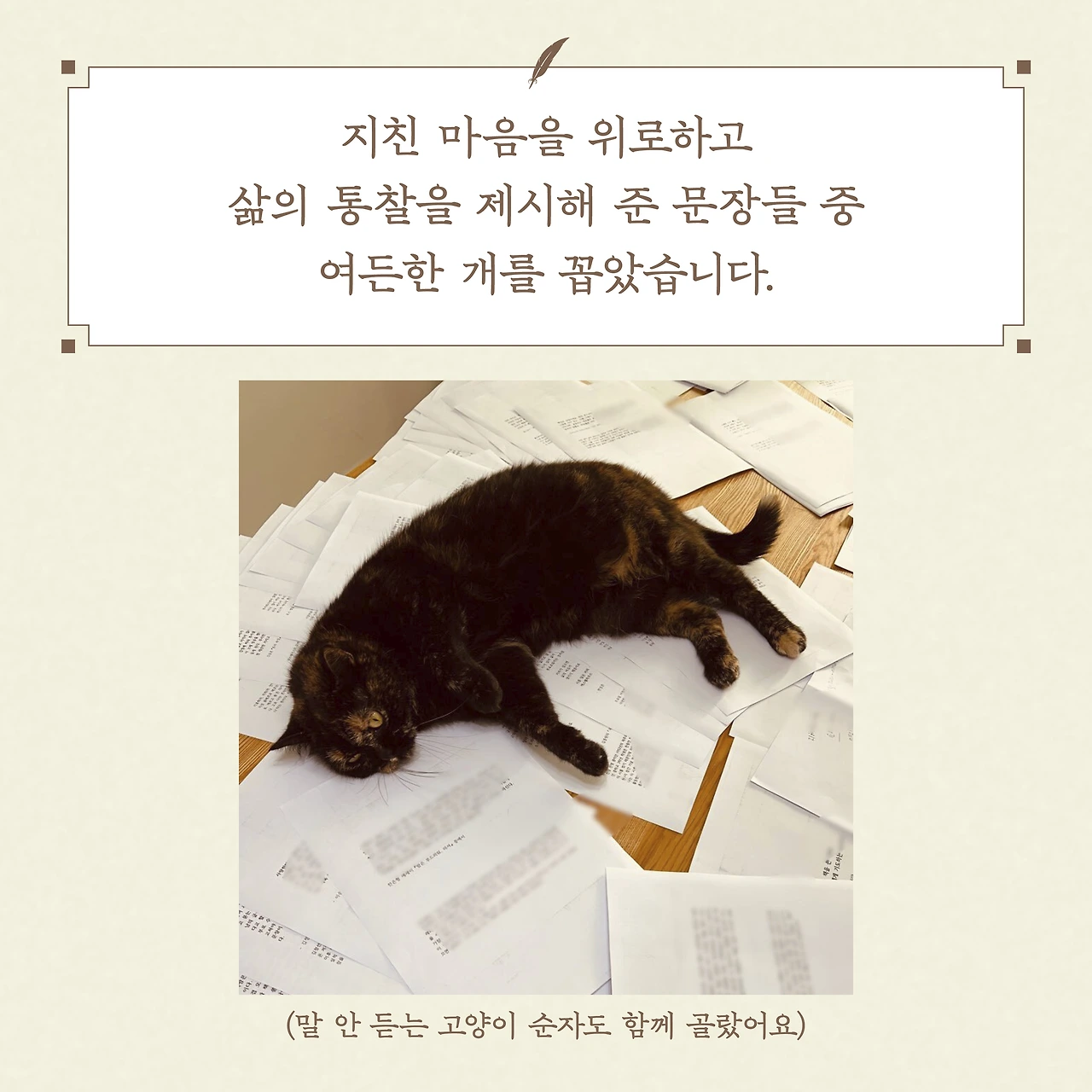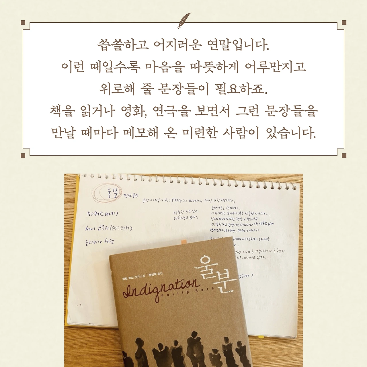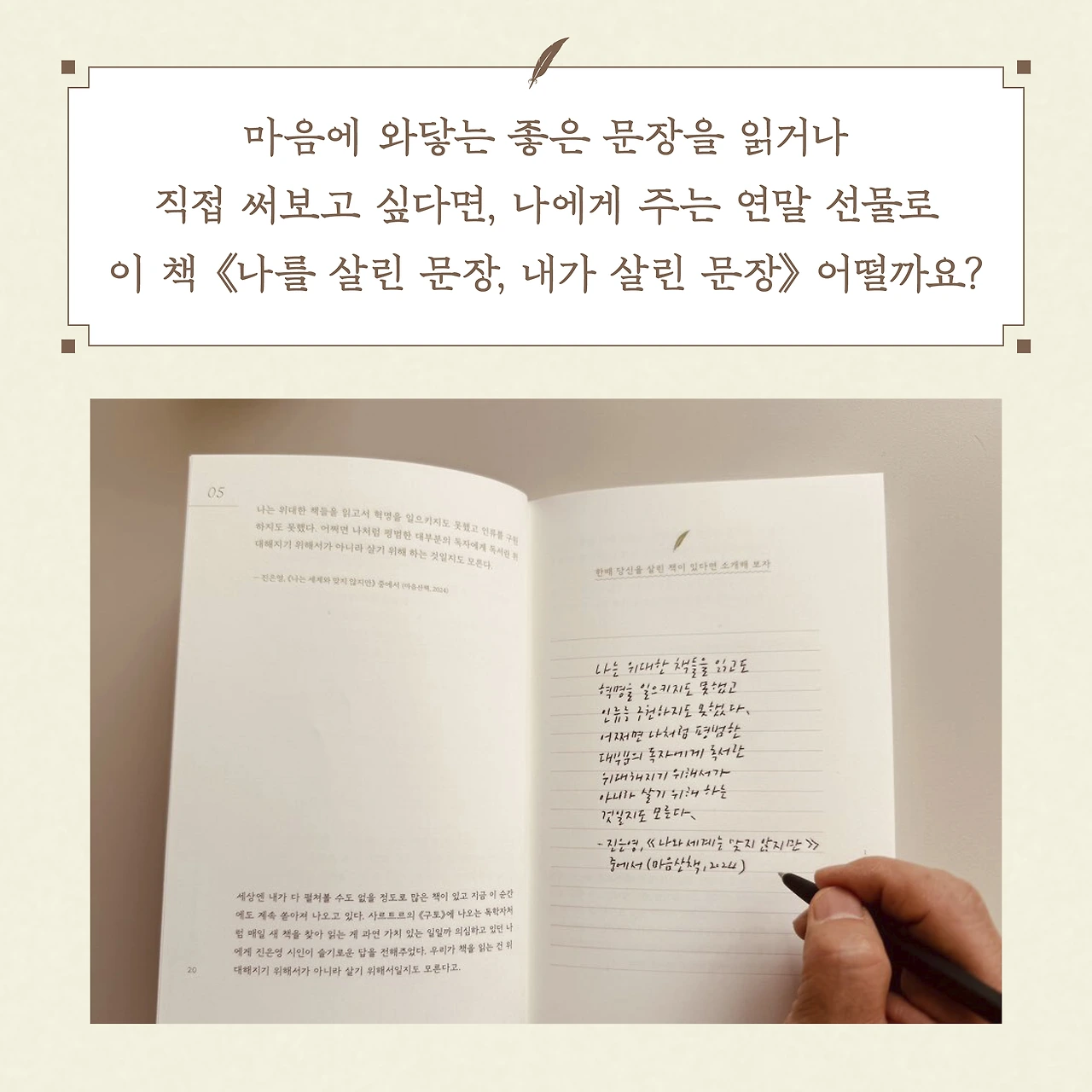 필사책이지만 마음에 드는 문장들을 읽으며 수첩이나 메모장, 일기장으로 활용할 수도 있습니다. 책 선물 인기 없다는 말도 옛말입니다. 메디치미디어의 이솔림 에디터가 방금 카드뉴스를 완성해서 보내왔길래 공유합니다. 제 책 많이 응원해 주십시오. 정성을 다해 쓰고 만들었습니다. 이 책을 선물하시면 분명 고맙다는 인사를 받으실 겁니다. 귀한 문장 인용을 허락해 주신 출판사와 작가들께도 깊은 감사를 드립니다. 구매 링크는 밑에 달겠습니다. 온라인서점 가서 구매하시거나 간단한 기대평 써 주신 분들은 복받으실 거예요. 내란 괴수 탄핵에 힘쓰며 새 책 홍보에도 힘쓰는 편성준 올림.