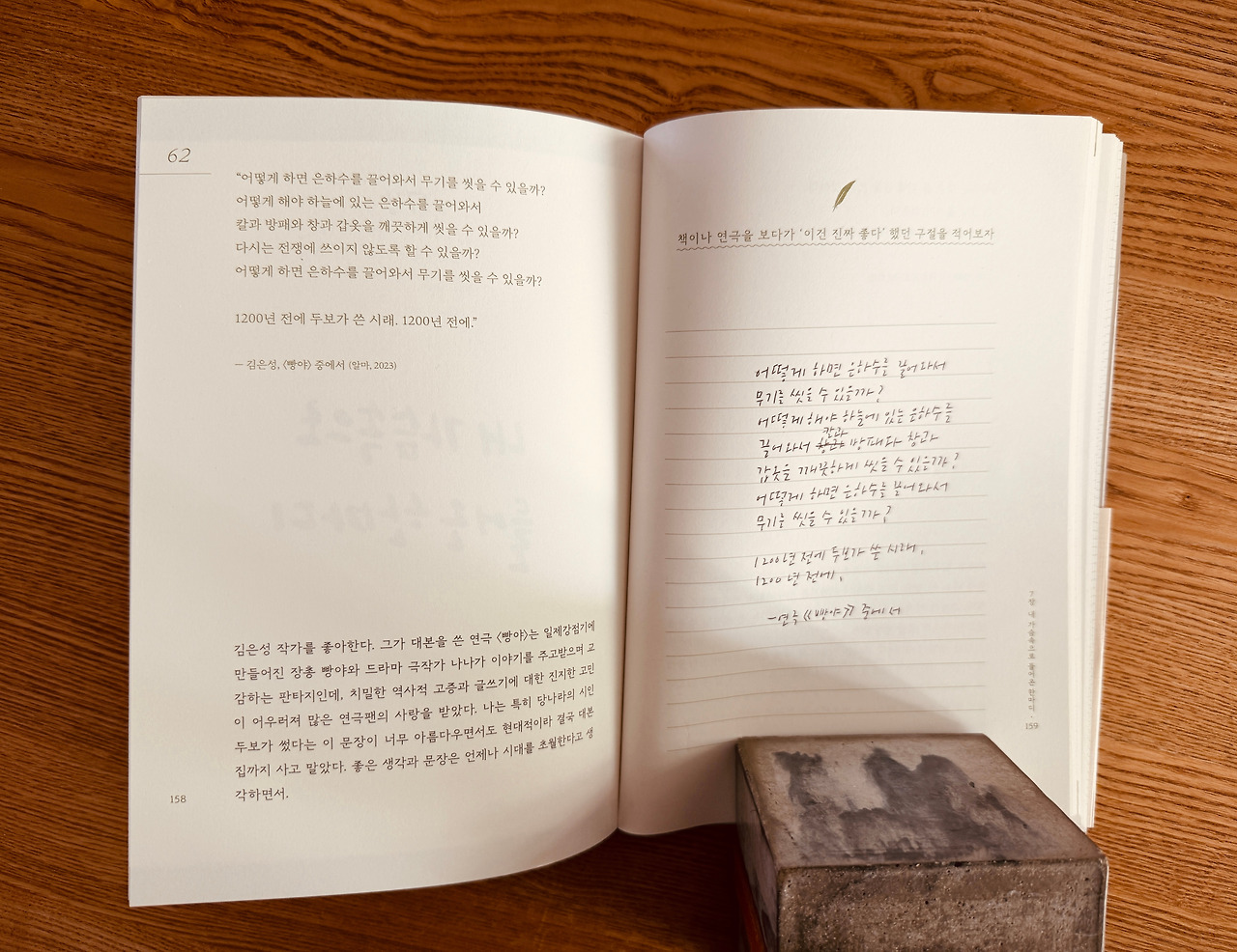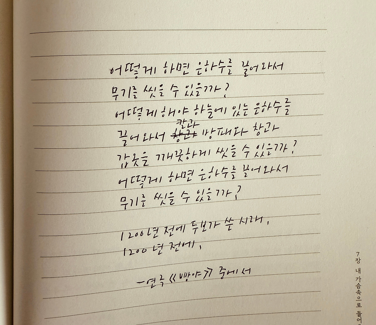 당나라의 시인 두보(杜甫)는 밤하늘의 은하수를 끌어다가 칼과 창과 방패를 씻고 싶다고 노래했습니다. 저는 그 얘기를 저의 책 『나를 살린 문장, 내가 살린 문장』에 수록했고요. 김은성 작가의 연극 <빵야>에 이 구절이 나오는 걸 감명 깊게 들었기 때문입니다. 최근 한 열흘 넘게 당한 끔찍할 뻔했던 일련의 사태를 돌아보고자 하는 마음도 있었고요.