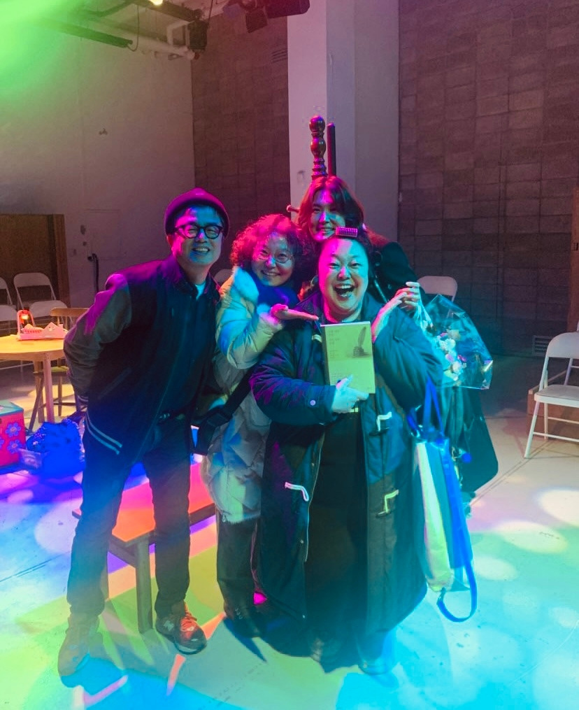 이런 있을 법한 이야기에 힘을 주는 것은 개방형 무대의 동선과 타이밍을 너무나 잘 조합한 이인수 연출의 힘과 김소연, 김수아, 윤현경 같은 배우들의 훌륭한 연기다. 박소연 배우의 활기찬 연기도 좋았지만 동성 커플을 열연한 김수아 윤형경 배우의 세심한 연기는 정말 감동이었다. 아내는 왜 이렇게 눈물이 나는지 모르겠다며 계속 내 손수건을 가져갔다(연극에 방해될까 봐 자신의 벨크로 가방을 열지 못했다고 한다). 연극이 끝나고 밖으로 나와 박소연 배우를 기다리다가 함께 나온 김수아 배우, 윤현경 배우와도 반갑게 인사를 나누었다. 김수아 배우는 나와 페이스북 친구라며 글 잘 읽고 있다고 인사를 해주어 더 기뻤다.
