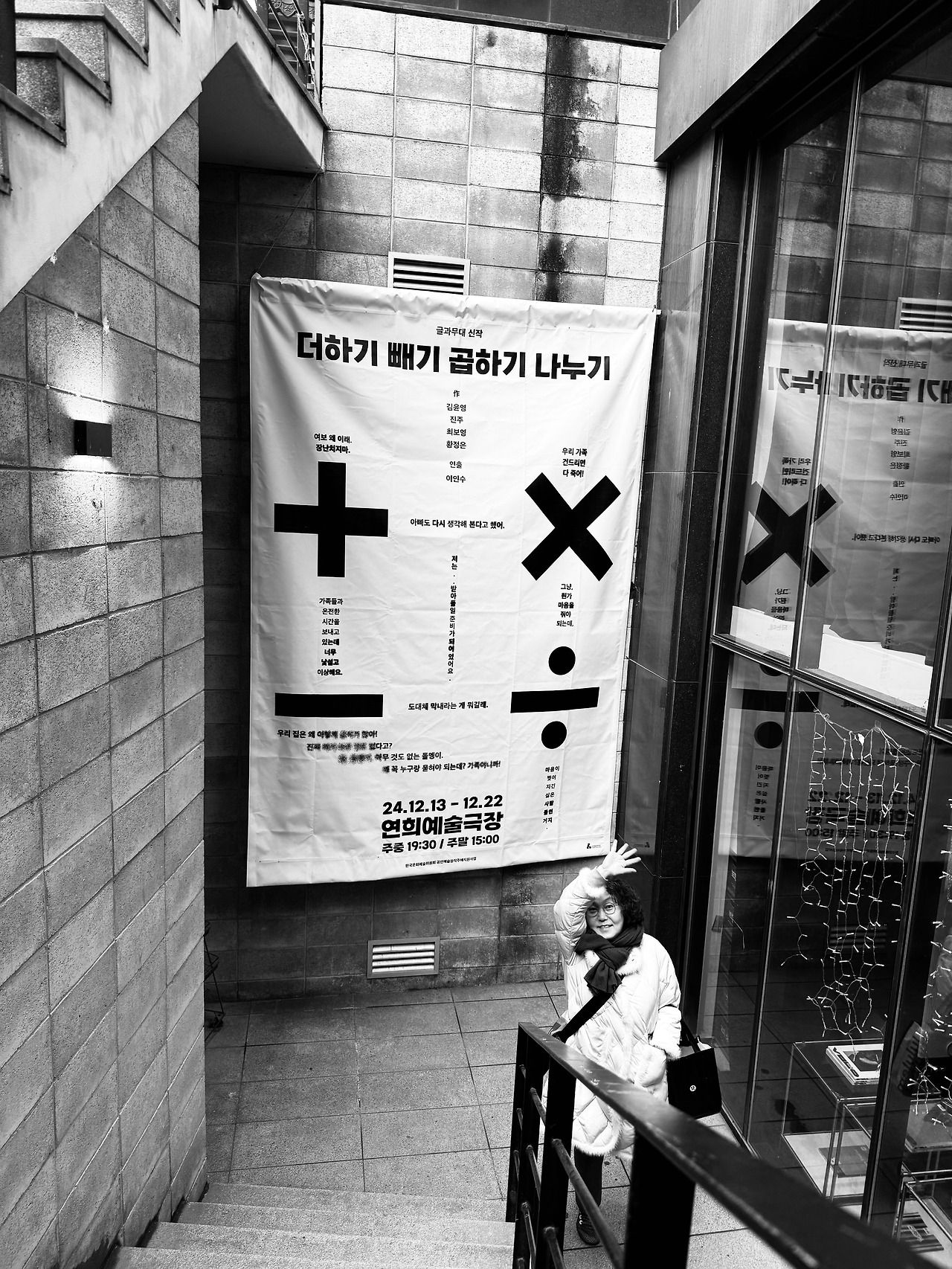 박소연 배우의 팬이다. 언제부터 팬이었는지는 잘 기억이 나지 않지만 그가 나오는 연극을 보고 실망한 적이 한 번도 없다. 최근에 《집집:하우스소나타》를 재밌게 봤고 심지어 《열녀를 위한 장례식》 때는 소행성 ‘책쓰기 워크숍’ 멤버들을 데리고 가서 함께 보기도 했다. 조선시대 규방의 여성들이 공동 창작하는 이야기였기 때문이다. 그런데 이번 《더하기 빼기 곱하기 나누기》는 '열녀를 위한...'의 연출, 작가, 배우들이 다시 뭉친 작품이니 안 볼 수가 없었다(계엄령 내란 파동으로 일상이 엉망이 된 탓에 뒤늦게 예매했다).
