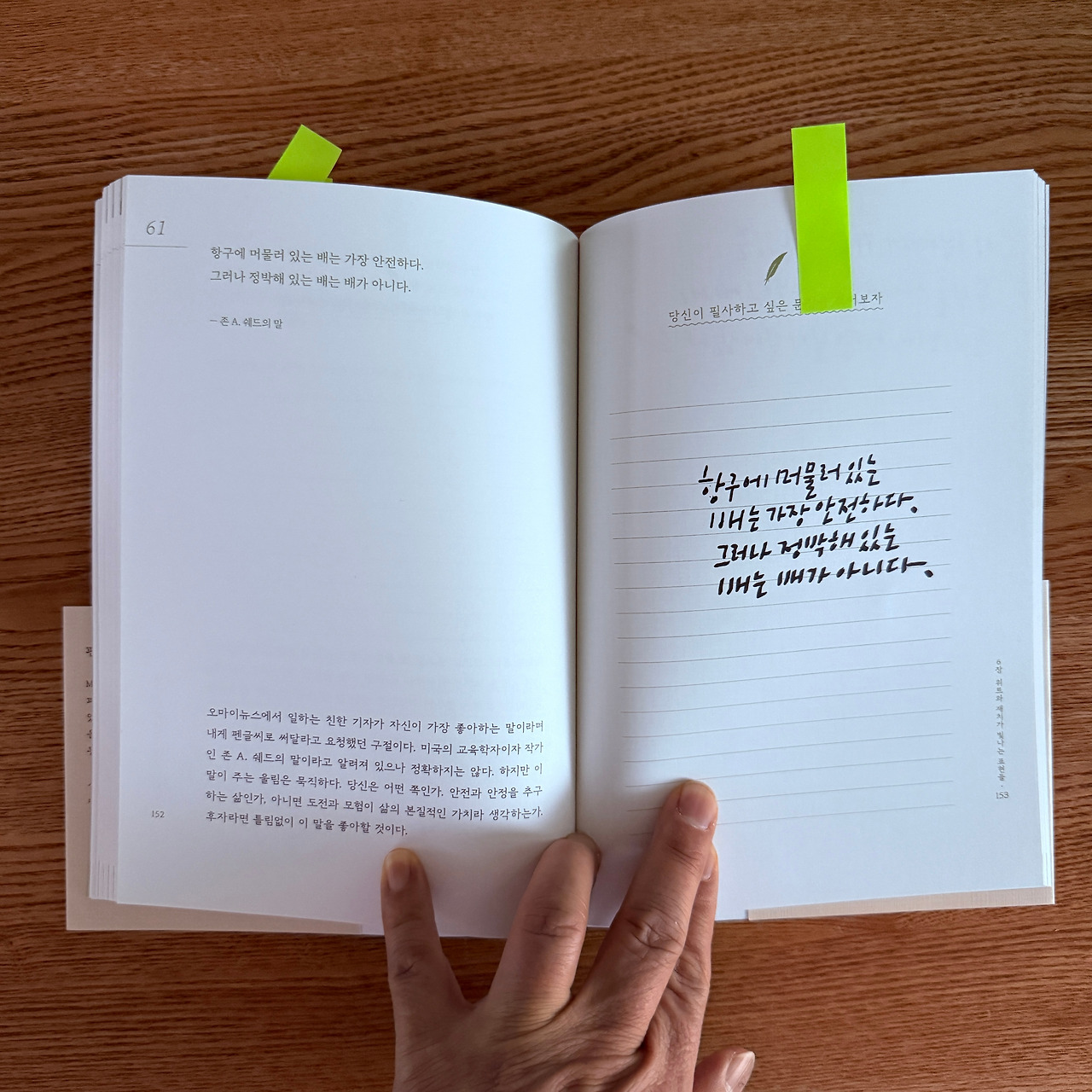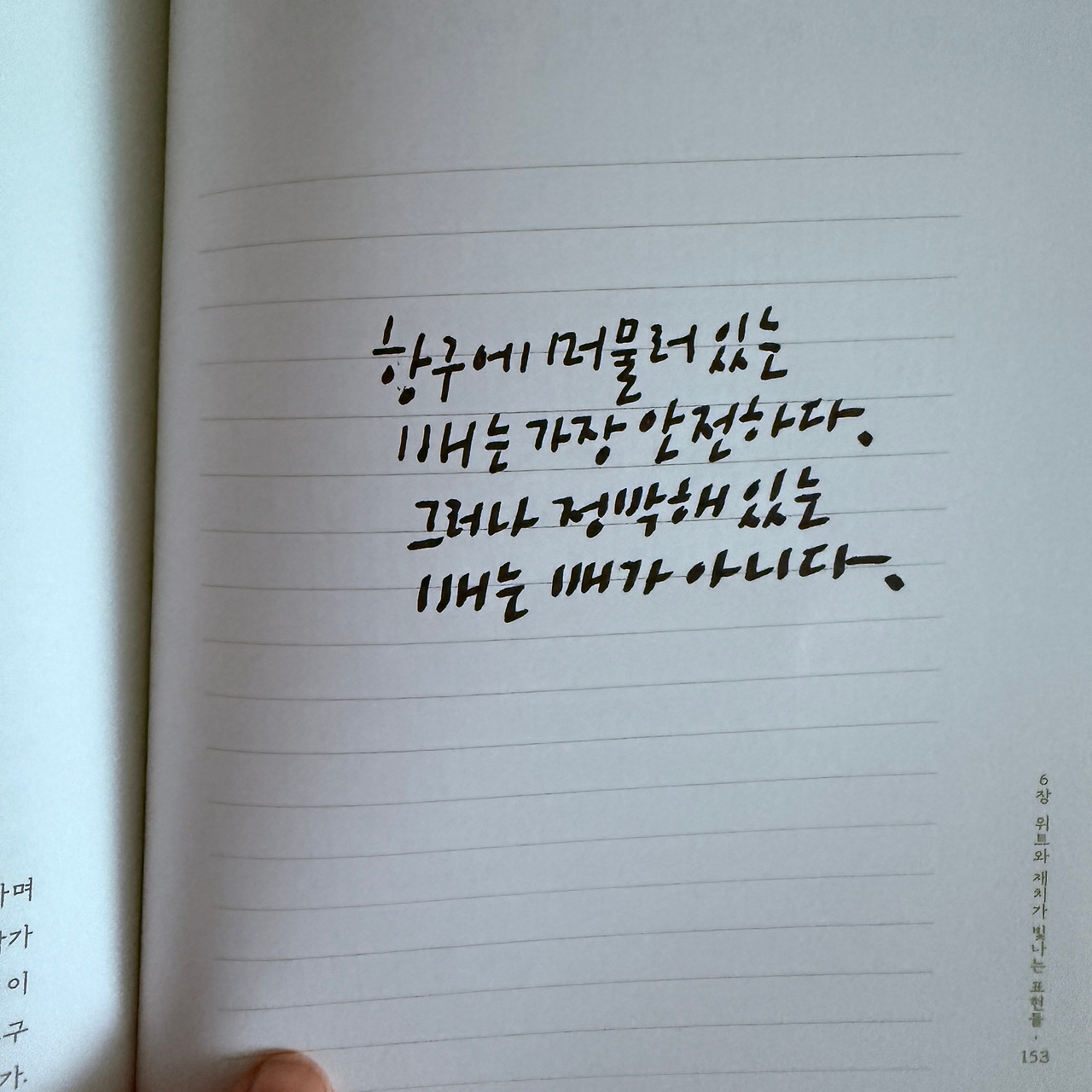 '배는 항구에 정박해 있을 때 가장 안전하다. 그러나 정박해 있는 배는 배가 아니다'라는 문구는 오마이뉴스 이한기 국장이 어느 날 캘리그라피로 써달라고 했던 내용입니다. 저는 이 글귀가 좋아서 이번 책 『나를 살린 문장, 내가 살린 문장』에 넣었습니다. 그리고 다시 한 번 새기려고 필사도 해보았습니다.