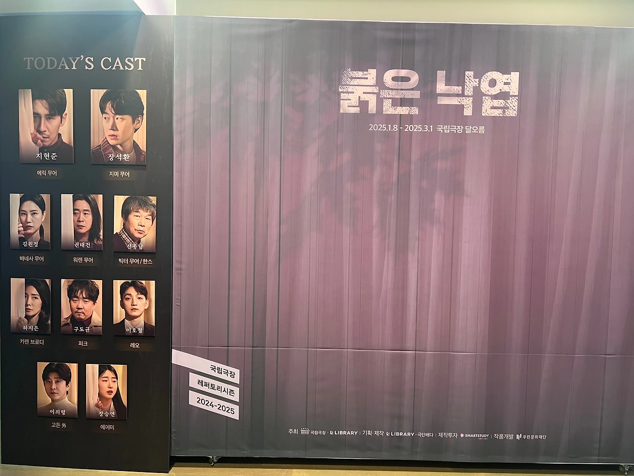 어제 국립극장 달오름극장에서 지현준 캐스팅의 <붉은 낙엽>을 보고 일어서며 중얼거린 말이다. 이 연극을 2021년 초연 때 보고 너무 괴로워했던 기억이 생생한데, 이번에 다시 보고 나니 그때 출연한 배우가 우리 부부에겐 안 맞았던 것 같다. 너무 어둡고 지루하기만 하던 연극이 이번엔 몰입감 100퍼센트로 돌변하는 신기한 경험을 했기에 진심으로 열렬한 박수를 치고 나왔다(마침 스마트폰을 집에 두고 극장에 가는 바람에 온전히 커튼콜에 몰입할 수 있었다. 대신 사진을 못 찍었다.ㅠ.ㅜ).