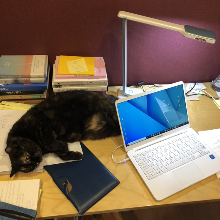 한 시간 이상 나를 쳐다보지도 않는 게 괘씸해서 일단 노트북 옆으로 가서 전자책 케이스를 깔고 누웠다. 주인은 혼자 뭔가 중얼중얼하다가 인터넷으로 검색을 하기도 한다. 어제 본 뮤지컬 기사를 검색하러 들어가서는 구혜선 부부가 이혼 문제로 트위터에서 싸우고 있다는 기사에 끌려 들어가 한참 들여다 보기도 하고 그러다가 페이스북에 들어가 조국 후보자에 대한 여론 글들을 읽기도 한다. 참으로 산만한 인간이다.