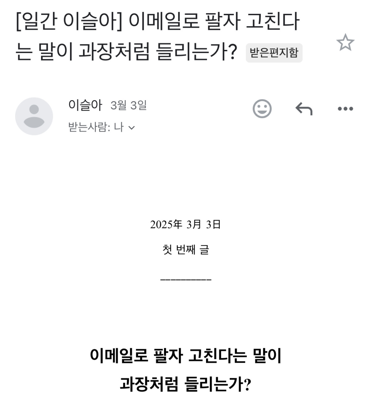 일간 이슬아를 다시 구독하게 되었습니다. 처음 일간 이슬아가 창간될 때 두 달 구독한 것 말고는 처음입니다. 그때는 일간 이슬아라는 아이디어가 신선하고 재밌어서 구독을 신청했고 #누드모델협회회원이라서가절대아님 이라는 장난스러운 해시태그를 붙이기도 했습니다. 그런데 그때 다니던 광고 프로덕션 일이 너무 바빴습니다. 그래서 그의 이메일을 제대로 읽을 시간이 없었죠. 지금 생각해 보면 '화살기도'라는 제목의 글을 읽은 기억이 겨우 날 뿐입니다.