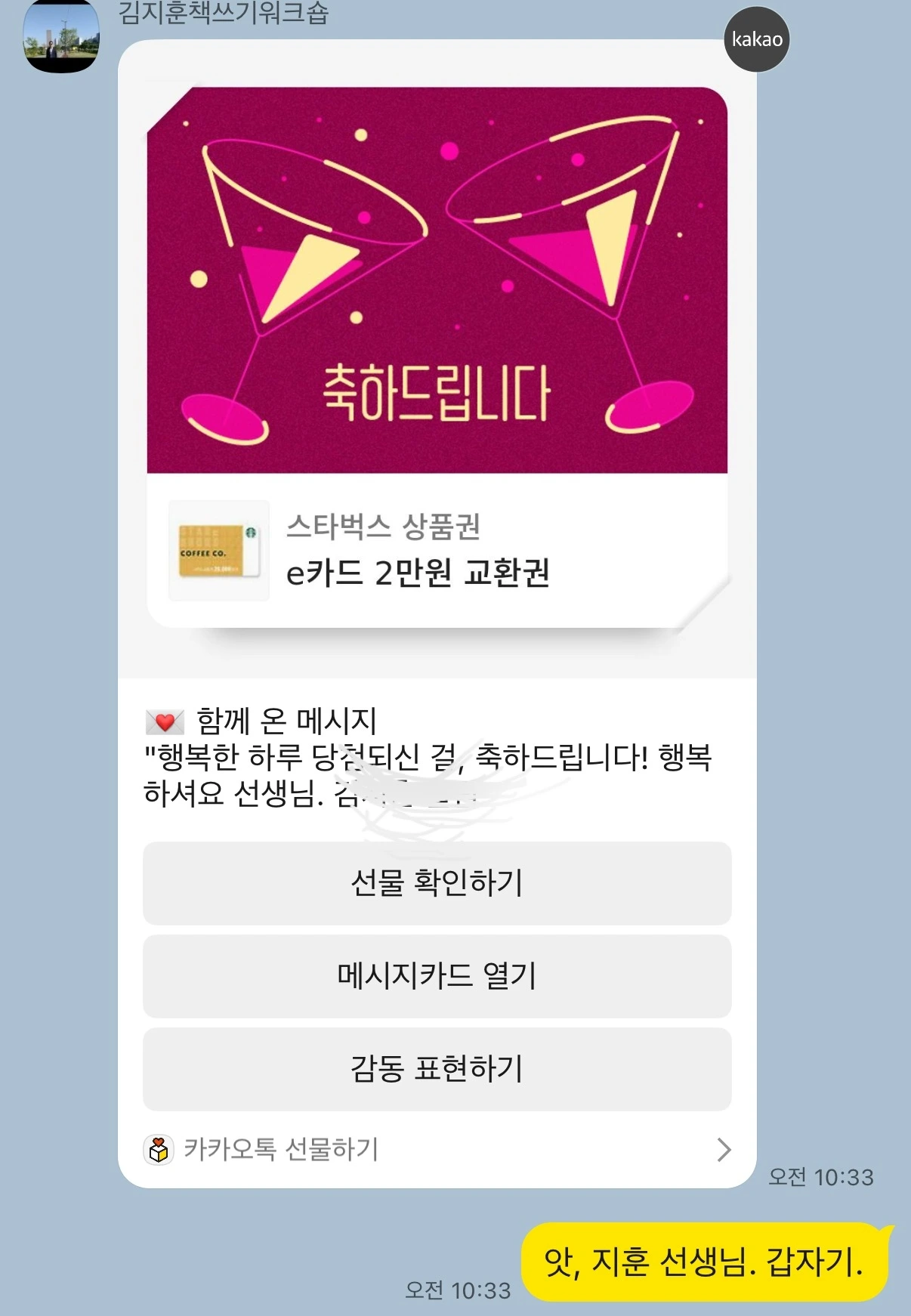 아침에 갑자기 카톡으로 축하 메시지와 함께 스타벅스 2만 원 상품권이 도착했다. 예전에 에세이 쓰기 5회 강연도 듣고 책쓰기 워크숍에도 왔던 김** 선생이 보낸 것이다. 나는 '축하받을 일이 없는데'라고 생각하며 카톡 메시지로 갑자기 선물을 보낸 이유를 물었다.
