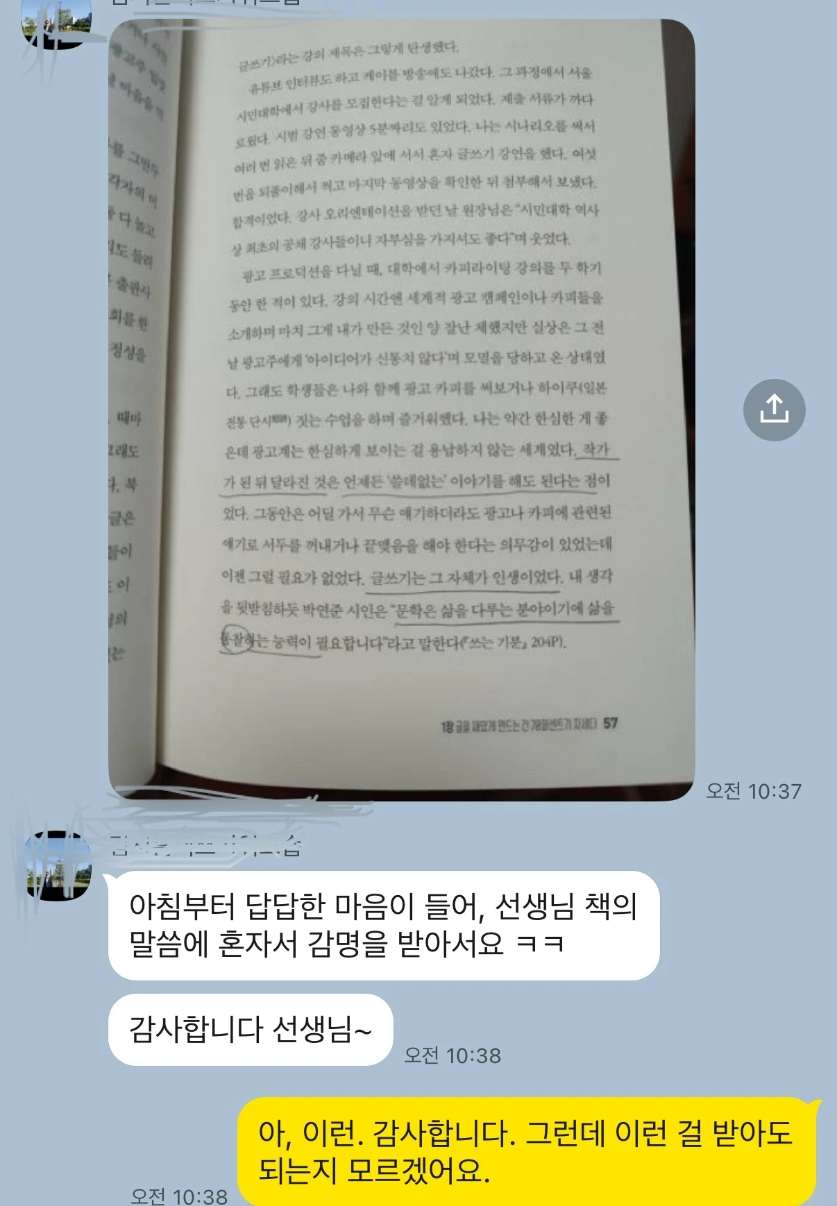그의 대답인즉슨 "아침부터 답답한 마음이 들었는데 선생님 책을 읽고 혼자 감명을 받아서요 ㅋㅋ"였다. 쑥스러우면서도 기뻤다. 카피라이터에서 작가로 변신한 이후 가끔 이런 순간들이 나에겐 작은 행복이다. 작지만 크다. 그래서 작은 건 다 아름답다.