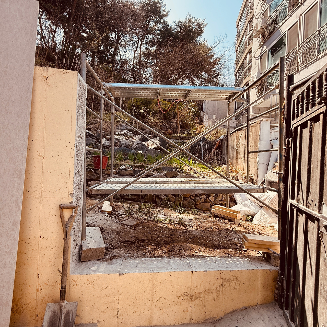 아침 겸 점심을 먹고 아내에게 현장에 가보자고 했다. 아내는 월요일 마감인 칼럼을 써야 하는 부담감에 얼굴이 좀 굳어 있었다. 하지만 막상 집 고치기 현장으로 가니 다시 마음이 부풀어 올랐다. 민원 때문에 잘라내야 했던 뒤쪽의 옹벽이 먼저 눈에 띄었다. 우리 집과 도로에 걸쳐 잇는 이 벽을 잘라내느라 장 반장님이 엄청 고생을 하셨다. 지난주엔 문제의 '파 아저씨'가 왔었는데 장 반장님이 "또 공사 방해하려고 왔어요?"라고 물었더니 사나운 기세에 질렸는지 아무 말도 못 하고 그냥 사라졌다고 한다.