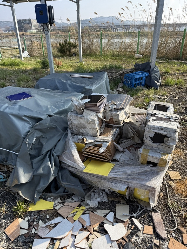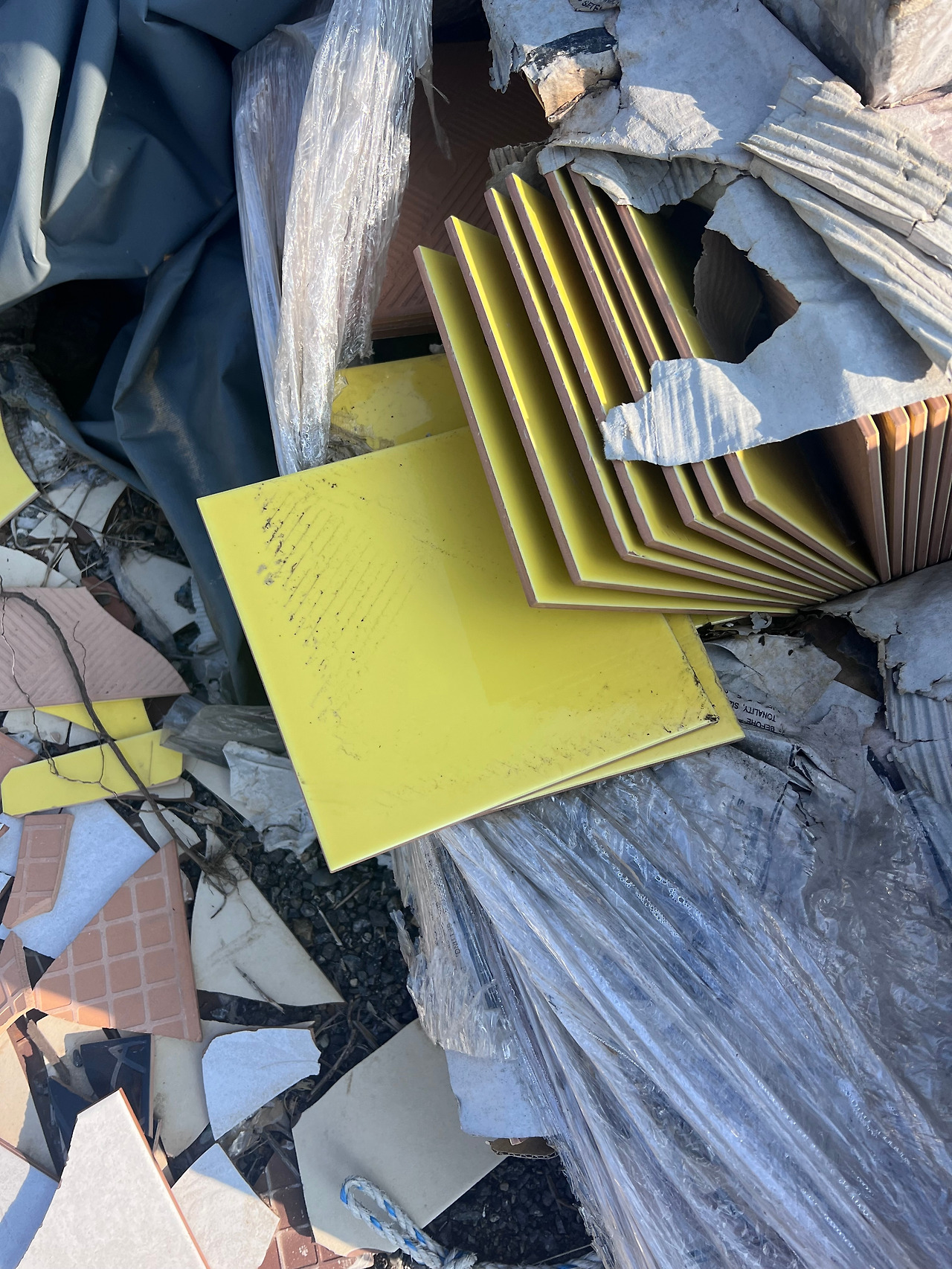 "임목수님, 나 어떻게 해야 해?" 기가 막힌 아내가 목수님에게 추정하듯 물으니 임 목수님도 그저 웃기만 했다. 그런데 그때 반전이 일어났다. 사장님이 "안 팔려서 뒤쪽에 내놓은 타일 있는데 한 번 보실래요?'라고 물은 것이다. 건물 뒤로 가보니 넓은 공터 여기저기엔 방수포로 덮어 놓은 타일 무더기가 여럿이었다. 우리가 노란색 타일이 한 장 놓은 방수포 앞으로 갔더니 사장님은 어차피 그건 안 팔려서 당근에 '무료 나눔'으로 내놓았는데 가져가겠다고 얘기만 하고 안 오는 사람이 있으니 그냥 가져가시라고 했다. 우리는 좋아서 입이 벌어졌다. 공짜로 얻을 생각은 하지도 못했는데 이게 무슨 행운이란 말인가.