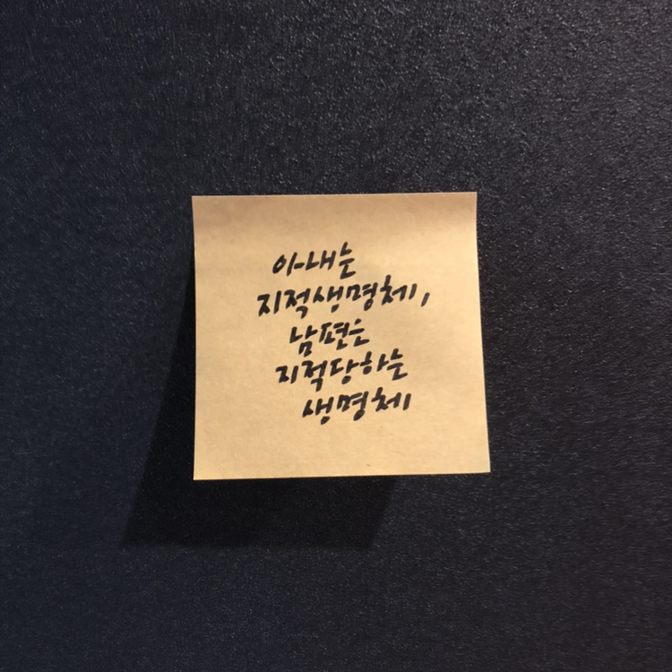 군대에 있을 때 내가 고참들에게 가장 많이 들은 꾸지람은 후임병들을 잘 갈구지(?) 못한다는 것이었다. 물론 나도 화가 날 때는 일졍 상병들을 무섭게 다그치기도 하고 얼차려를 주기도 했지만 남들처럼 후임병들의 관물대를 뒤져가면서 사사건건 트집을 잡거나 인생 형님의 포스로 군기를 유지하는 건 도저히 내가 할 수 없는 경지의 일이었다. 성격인 것 같았다. 결혼을 해서는 아내에게 지적을 당하는 일이 많았는데 덕분에 설거지나 청소 등에서는 눈부신 발전을 했으나 인간관계나 결정적인 선택, 미래 설계 등등의 분야에서는 여전히 젬병이다. 그래서 '아내는 지적인 생명체, 남편을 지적 당하는 생명체' 라는 공처가의 캘리를 생각해 내고는 혼자 흐뭇해져서 조금 웃었다.
