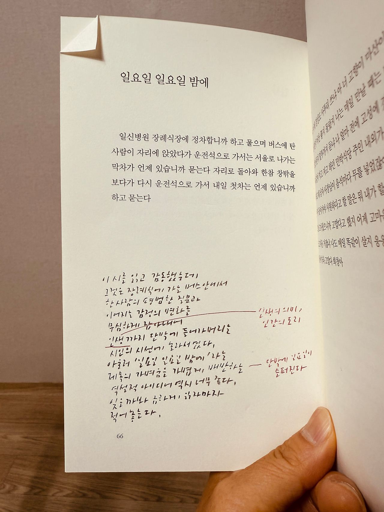 그런데 놀라운 시였습니다. 시인은 이런 존재이죠. 장례식장에 들러 가는 평범한 버스 안에서 평범한 한 남자의 질문과 이어지는 감정의 변화를 무심하게 포착해 단박에 인생의 메타포로 밀고 들어가는 괴력을 지닌 사람. 더구나 일요일 일요일 밤에, 라는 제목의 가벼움을 배반하는 역설적 아이디어는 이내 멋진 시를 읽는 즐거움까지 선사합니다.