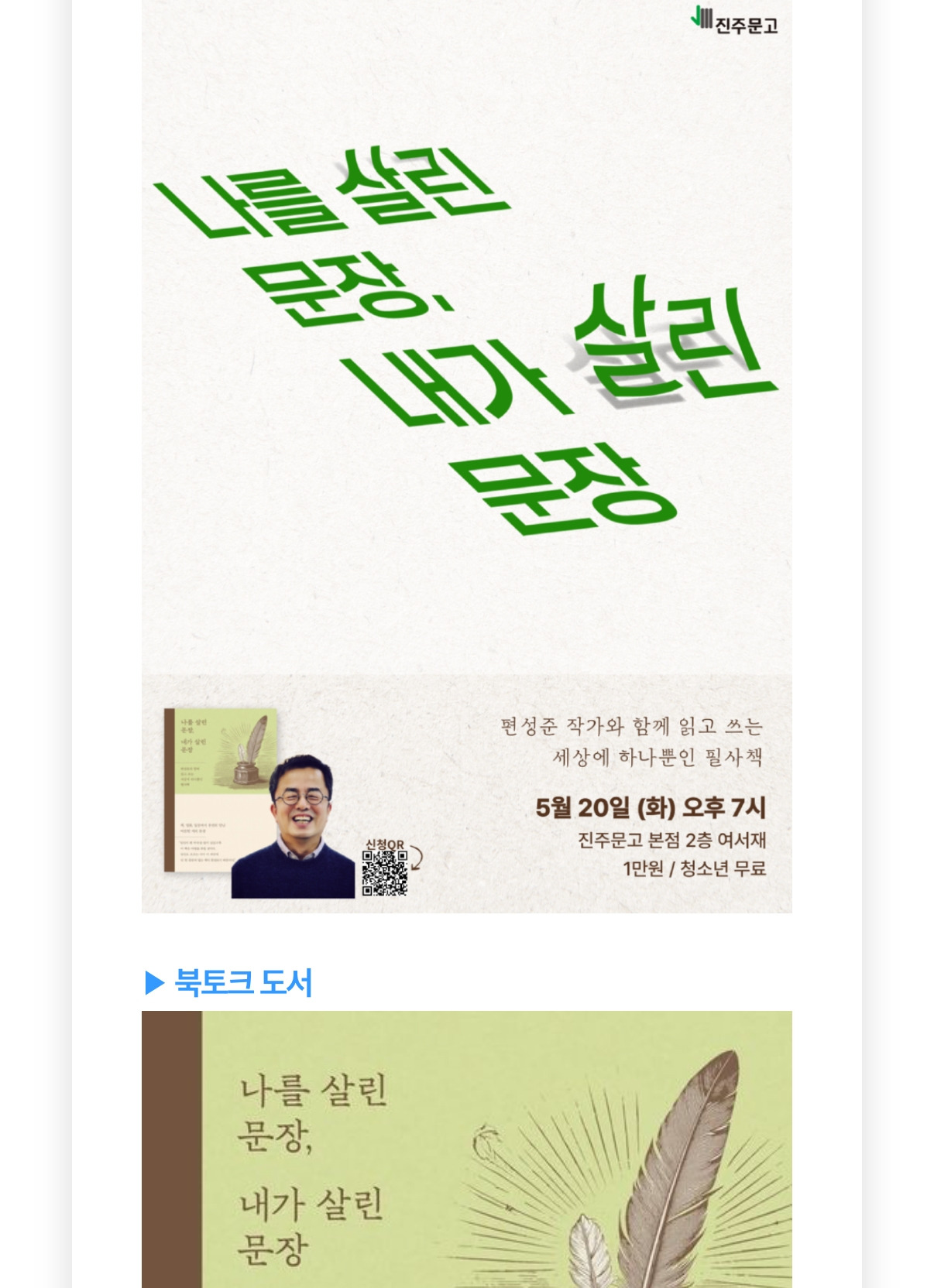 말씀드린 대로 오는 05.20(화) 오후 7시에 진주문고에서 『나를 살린 문장, 내가 살린 문장』으로 북토크 합니다. 행사 사회는 진주에 사는 고강훈 대표가 맡아주시기로 했습니다. 진주문고에서 벌써 세 번째 하는 북토크입니다(여태훈 대표님과 이병진 팀장님, 고맙습니다).