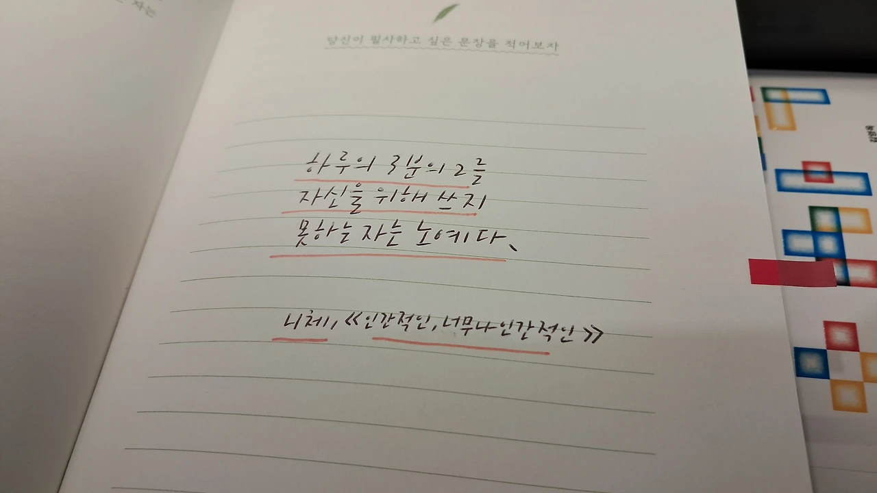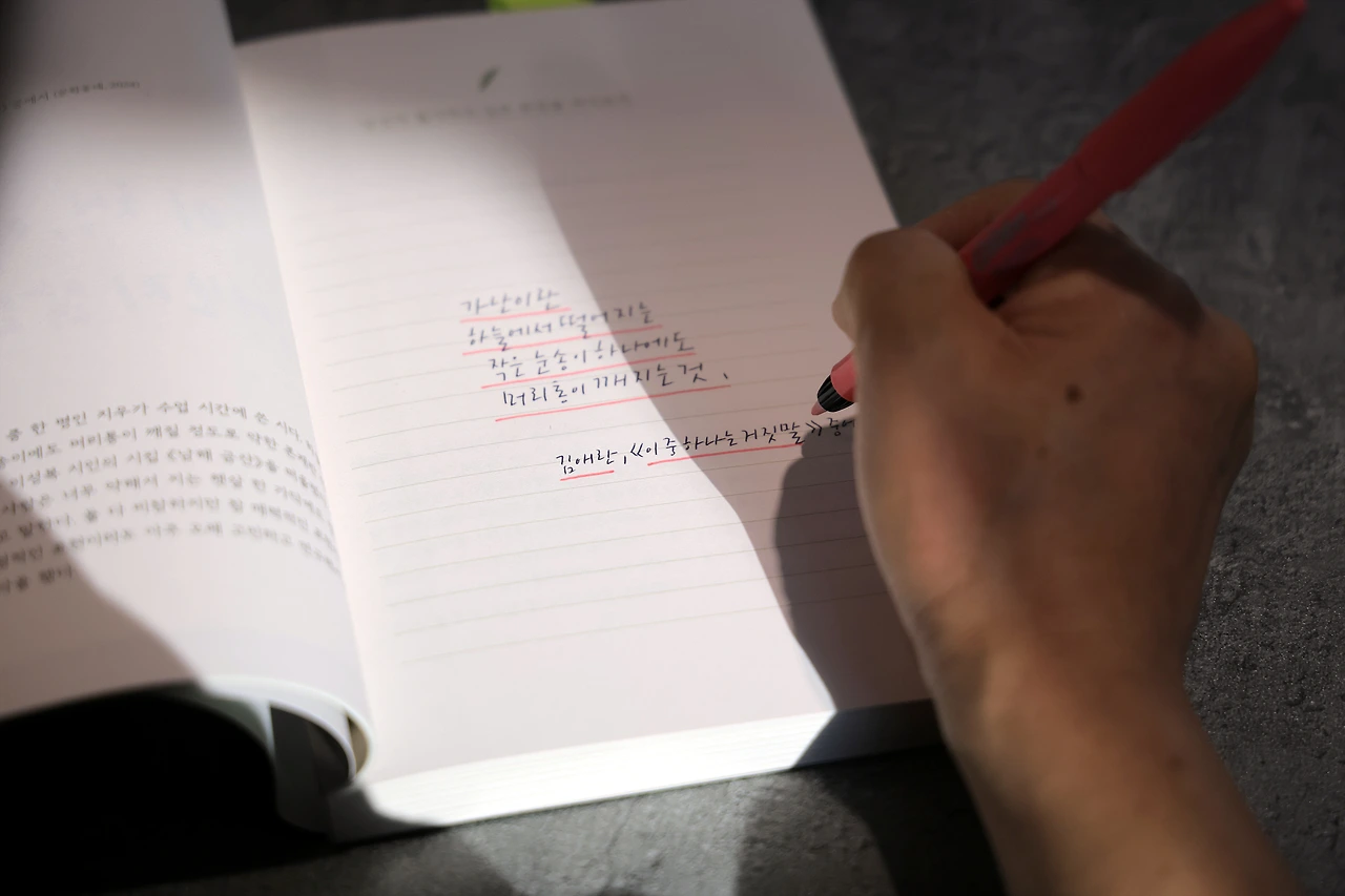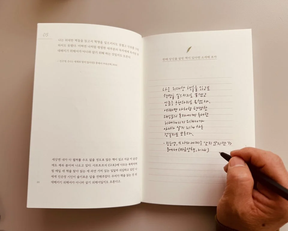 필사의 시간도 잠깐 갖겠습니다. 제가 예쁜 컬러 종이를 가져갈 테니 당신은 연필이나 볼펜 한 자루만 가져오시기 바랍니다. 행사 때 정성껏 쓰신 필사 문장은 편지처럼 접어 가까운 사람에게 선물하셔도 좋고 액자에 넣어 표구하셔도 좋습니다).