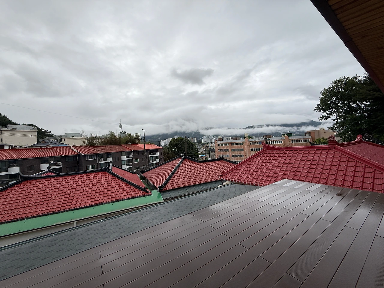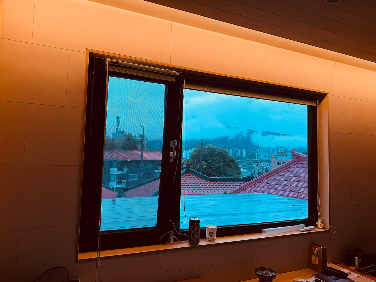 보령 소행성의 2층에서 본 동네 산과 지붕들