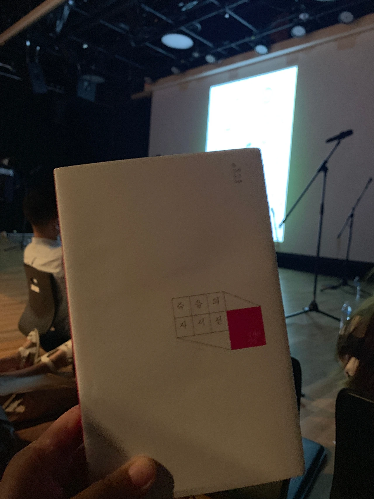 무대 정중앙 뒤쪽에 김혜순 시인이 자신의 시집 [죽음의 자서전]을 들고 섰다. 그 옆과 앞으로 두 줄을 만들어 성다영, 김상혁, 이제니, 김행숙, 황인찬, 백은선 시인이 차례로 섰다. 놀라운 진영이었다. 그들은 시를 읽어나가기 시작했다. 마치 농부가 소와 함께 밭에 서서 한 줄 한 줄 밭고랑을 갈아나가듯 한 편씩 한 편씩 시를 읽어나갔다. 지하철에서 죽은 사람의 이야기인 <출근>부터 시작하자 갑자기 어렵던 시들이 몸 안으로 쑥 밀려 들어오는 기분이 들었다.