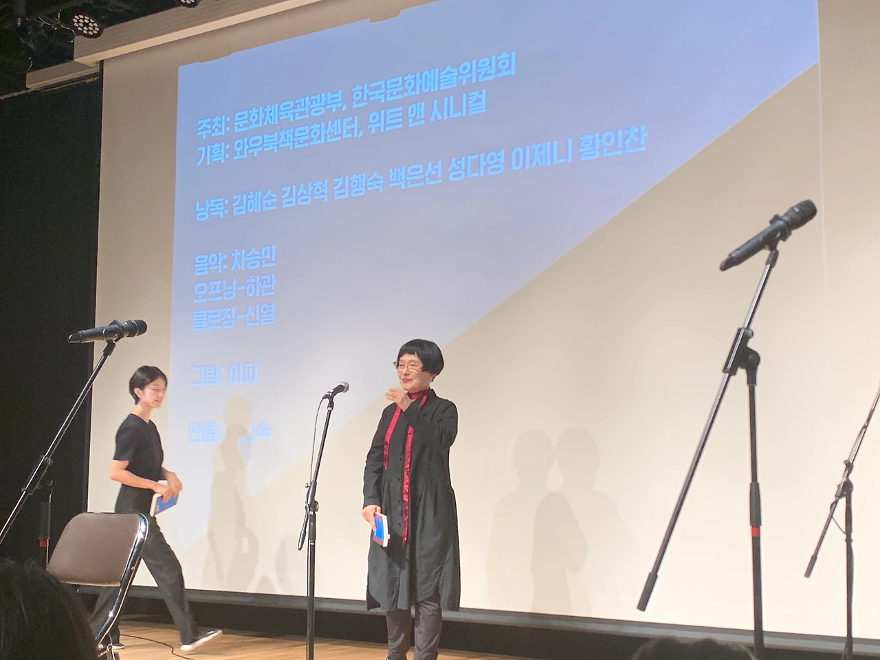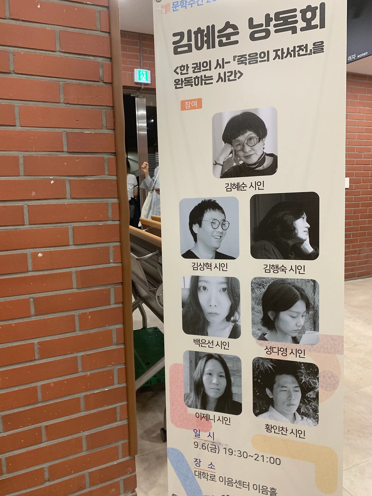어제인 2019년 9월 6일(금)엔 대학로의 '이음센터 이음홀'에선 캐나다 그리핀시문학상을 수상한 시인 김혜순 시인이 6명의 후배 시인들과 함께 그의 수상 시집 [죽음의 자서전]에 실린 시 49편을 처음부터 끝까지 전부 낭독하는 행사가 열렸다. 나와 아내는 2박 3일간의 지방 취재여행 때문에 무척 피곤한 상태였지만(특히 나는 초보운전인 주제에 차를 몰고 전남과 전북 여기저기 산골들을 수백 킬로미터나 돌아다니느라 지쳐서 거의 제정신이 아니었다) 그래도 미리 예약해 놓은 '김혜순의 시 낭독회'가 뭔지 궁금해서 택시를 타고 뒤늦게 대학로로 달려갔다. 행사장 입구엔 이미 많은 관객들이 모여 있었고 이 행사를 기획한 시집 전문서점 '위트 앤 시니컬' 사장님 유희경 시인의 모습도 보였다.