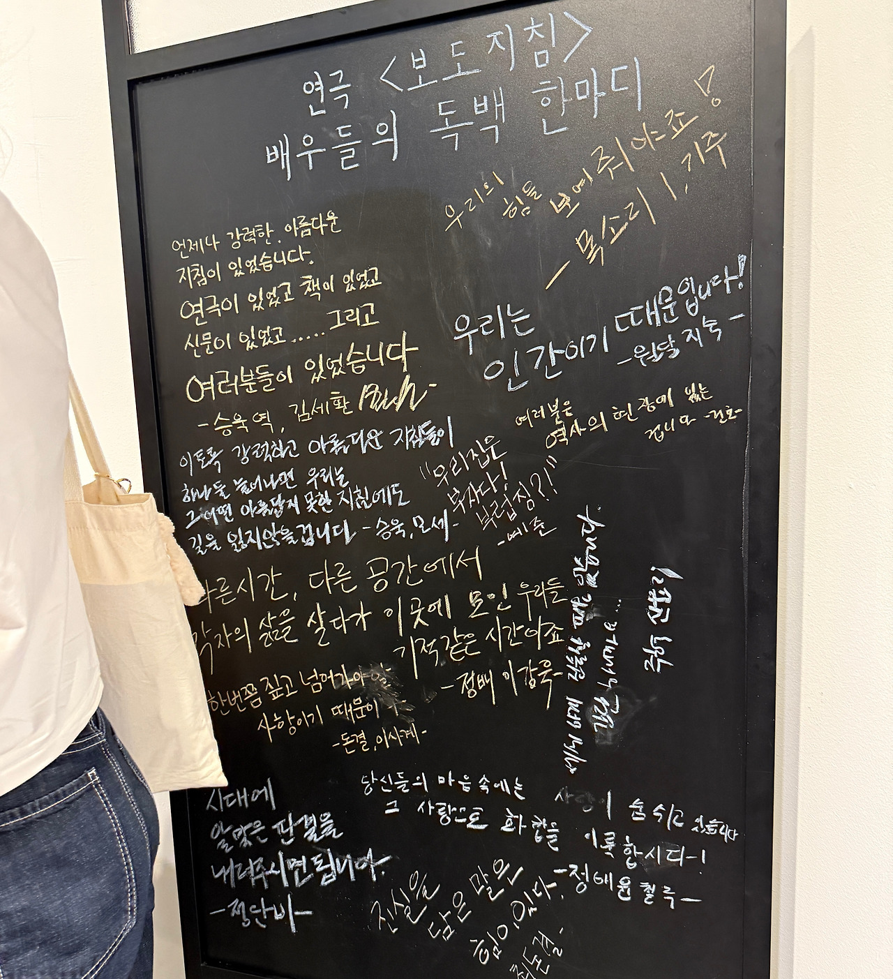 아내와 나는 "배우나 연출도 뛰어나지만 역시 시공간을 넘나드는 자유로움과 역사적 사실들에 의미를 불어넣을 줄 아는 각본이야말로 이 연극을 명작 반열에 오르게 한다"라고 합의를 보았다. 아내는 오세혁이 천재라는 말까지 했다. 연극이 끝나고 관객들이 쓴 독백 멘트를 배우들이 낭독해 주는 이벤트가 있다고 했는데 스케줄이 안 맞아서 그냥 나왔다. 객석 구석에 앉아 있던 오세혁 작가도 힐끗 보았는데 인사는 못 나누고 말았다. 나중에 오 작가가 전화를 했길래, 연극 잘 봤어요(물론 내돈내산으로 봄), 결혼 축하합니다(11월에 결혼식 올림) 등등 인사만 하고 말았다. 2025년 8월 17일까지 서울숲씨어터에 공연한다.