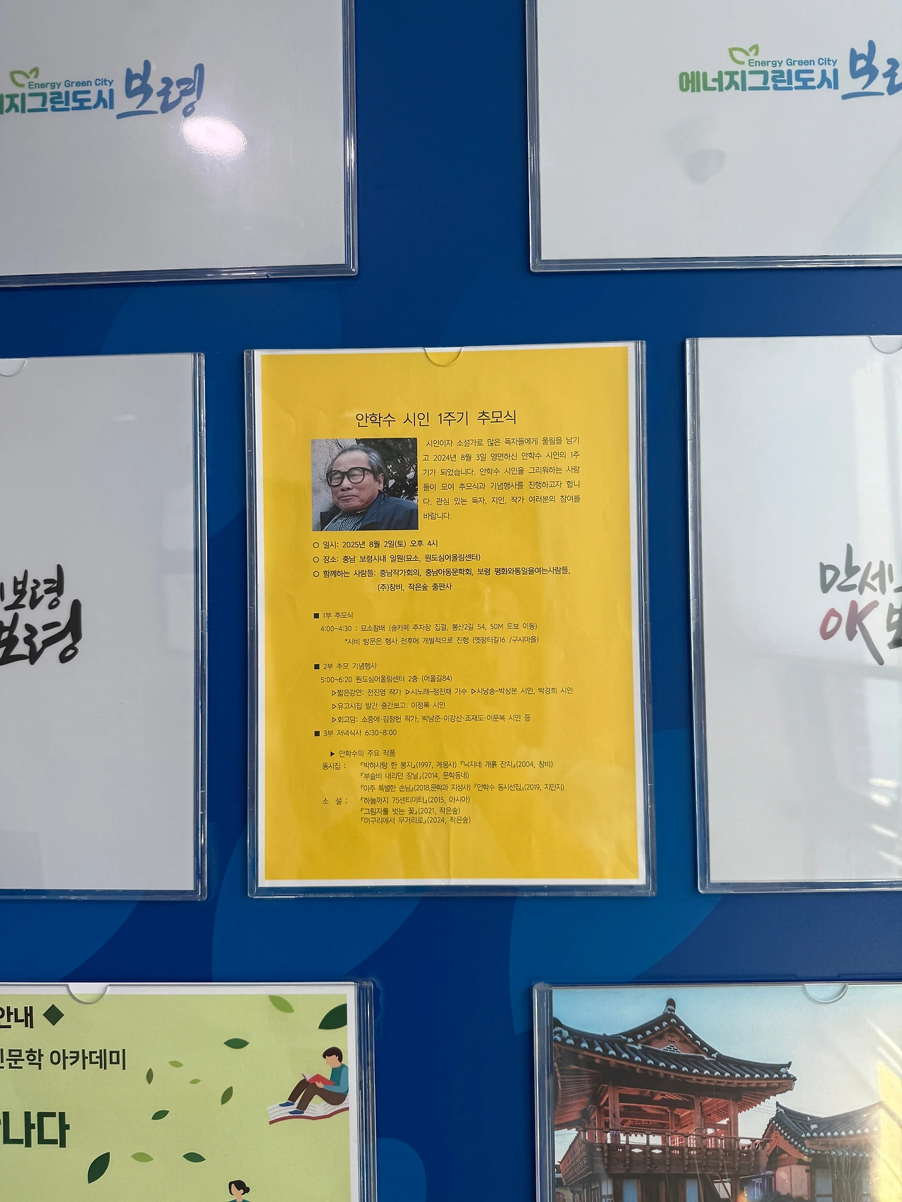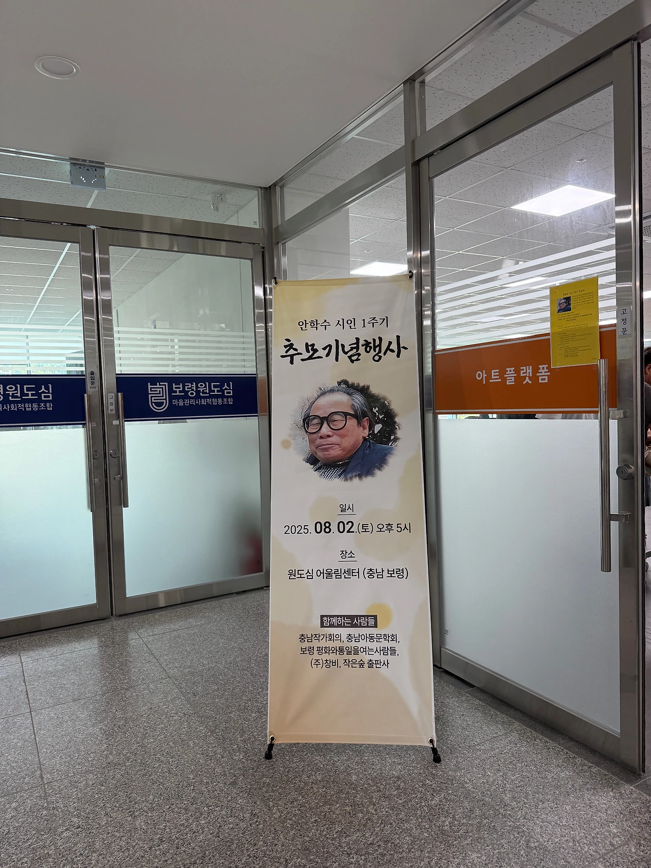 새로 이사 온 보령 대천동 뒷산에 안학수 시인의 무덤이 있습니다. 제가 산책이나 하려고 뒷산 길 올라가다가 발견했죠. 사실은 보령 와서 처음 만난 김환영 화백 때문에 안학수 시인의 존재를 알게 되었고 그제 그의 1주기 추모기념행사에도 참여할 수 있었습니다. 무덤에서 행해진 추모 행사에서 안 시인의 부인인 소설가 서순희 선생을 비롯한 많은 문인들과 처음 인사를 나누었습니다. 물론 '디딤돌인문학' 강사 모임에서 먼저 얼굴을 익힌 이강산·이정록 시인, 그리고 이정모 관장님 보령 강연 때 만났던 황선만 작가에게도 반갑게 인사를 드렸고요. '낙지네 개흙 잔치'라는 동시를 다 같이 낭독하고 행사를 마쳤습니다.