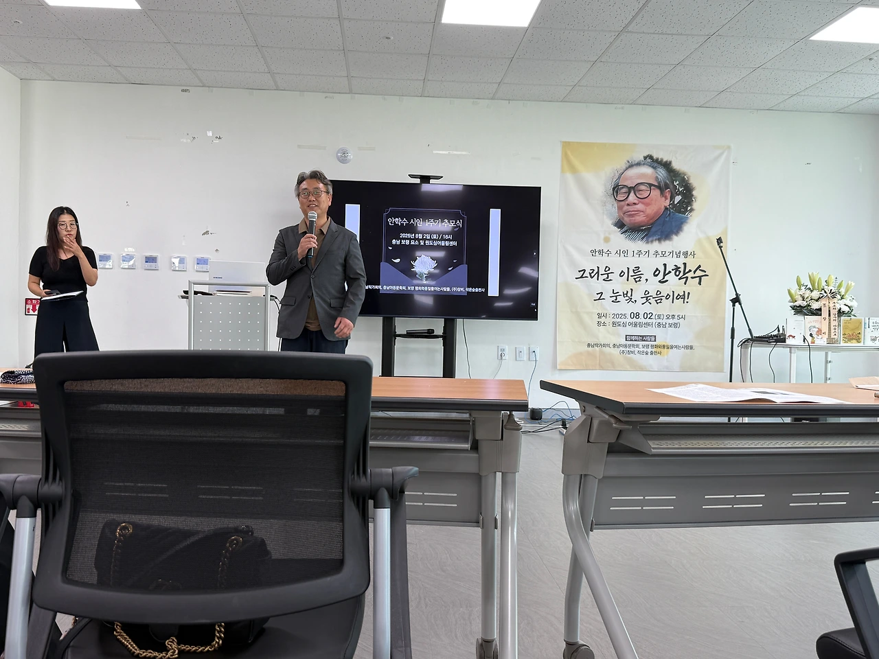 이어 원도심어울림센터에서 진행된 추모식에서는 이오우 시인의 개회사에 이어 전진영 작가의 특강이 있었습니다. 뒤늦게 동시 작가가 되고 싶어 대한민국에 있는 동시집을 거의 다 읽었노라 자부하는 전 작가는 안학수 시인의 첫 시집 『박하사탕 한 봉지』를 읽고 '시가 왜 이렇게 거칠어?'라고 생각했답니다. 하지만 혼자 노는 아이'나 '새엄마' 같은 시를 읽으면서 안 시인이 제대로 양육받지 못하는 아이들의 상황을 극적으로 보여주고 있음을 깨닫습니다. 자신도 평생 불편한 몸으로 살았던 아픈 현실 속에서도 안 시인은 아이들을 따뜻하게 품은 동시를 쓰고 있었던 것이죠. 전 작가가 편지봉투에 넣어 온 시들을 하나씩 낭독하는 시간을 가졌는데 저도 한 편을 소리 내어 읽었습니다.