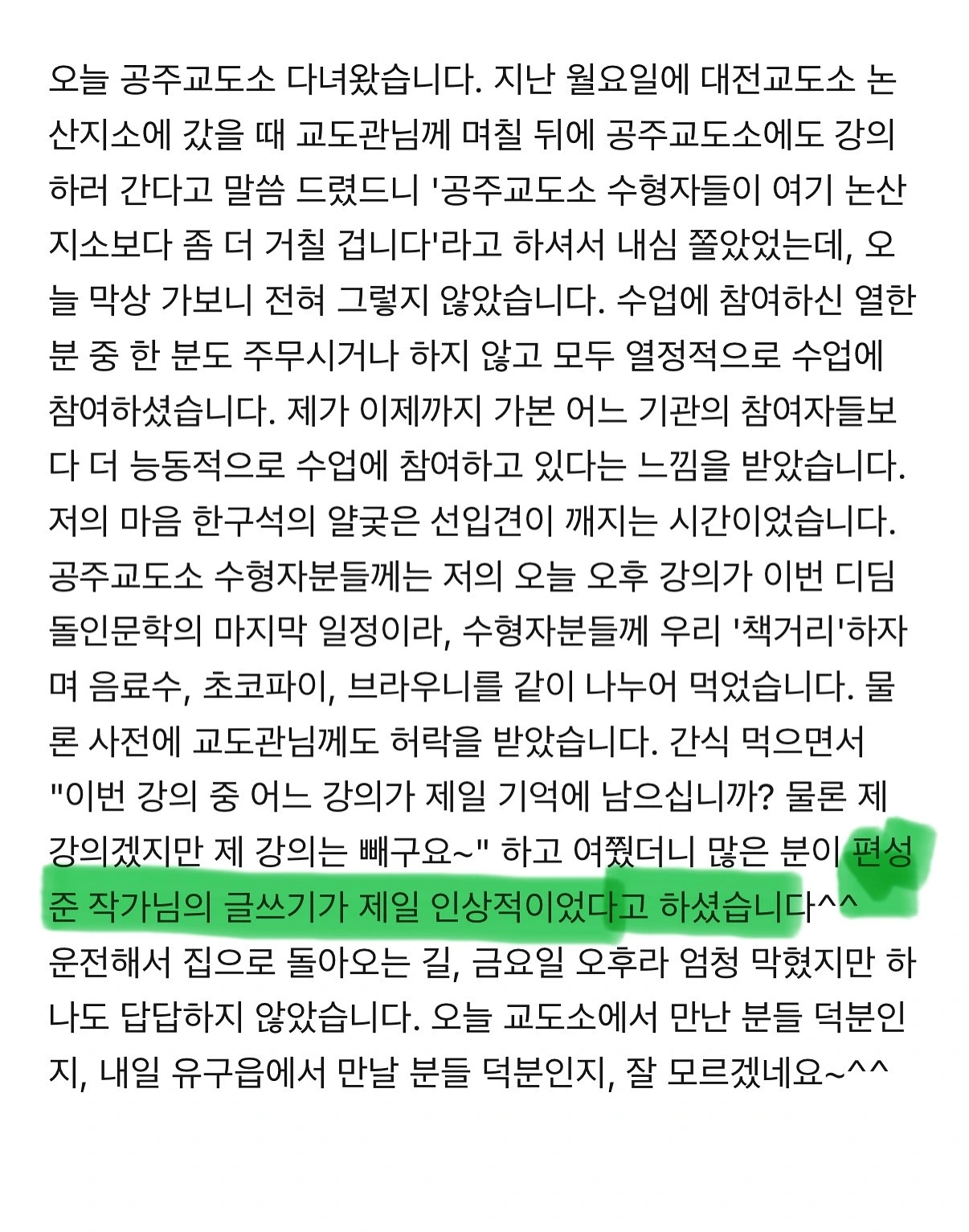 그런데 나중에 가신 강사 한 분이 이번 교도소 인문학 강좌 중 어느 강의가 제일 기억에 남느냐고 물었더니 “편성준 작가의 글쓰기가 제일 인상적이었다”라는 대답을 해주셨다는 것입니다. 강사 단톡방에서 그 이야기를 읽은 저는 심장이 멎을 것처럼 놀랍고 기뻤습니다. 이 평가야말로 가장 솔직하고 직관적인 칭찬이니까요. 전문가로 불리는 사람은 자신이 가진 지식을 다른 사람들에게 쉬운 말로 전달하고 가르칠 수 있어야 한다고 생각합니다. 그런 면에서 저는 이번에 글쓰기 강의 전문가로 확실히 인정을 받은 것 같아 뿌듯했습니다.