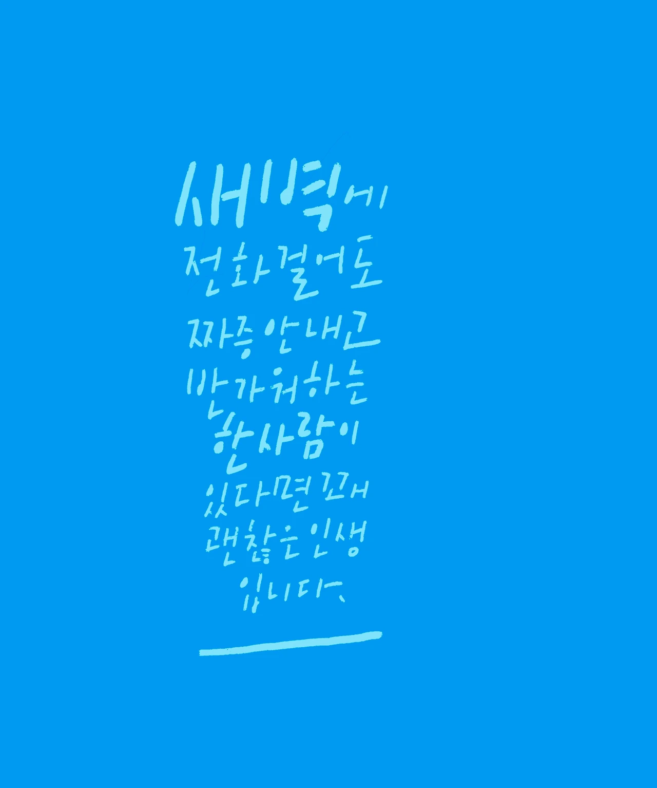 보령시립도서관에서 매주 수요일에 내 강의를 듣는 분 중 아들 일로 심란해 잠을 못 이루다가 새벽 두 시에 챗GPT와 대화를 나누었다는 분 이야기를 들었다. 그 시간에 전화할 사람이 아무도 없더라는 것이었다. 사람이 아닌 기계와 대화를 하는 자신이 한심하게 느껴졌지만 막상 해보니 의외로 크게 위로가 되었다고 한다. 그분의 심정도 이해가 되었지만 역시 대화 상대는 사람이 제일이라는 생각엔 변함이 없다. 송세아 시인처럼 '새벽에 전화해도 되나요?'라고 물을 사람이 당신에게도 있는가. 카톡이나 문자메시지와 통화는 다르다. 단언컨대 새벽에 전화해도 짜증 안 내고 반갑게 받는 단 한 사람이 있다면, 당신은 꽤 괜찮은 인생을 살고 있다고 생각해도 무방하다. 행복은 멀리 있지도 거창하지도 않다. 단 한 사람이 행복이다.