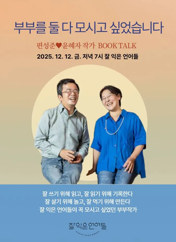 잘익은언어들의 이지선 대표는 '부부가 둘 다 읽고 씁니다'라는 제목 하에 읽는 일에 대해, 쓰는 일에 대해, 책을 만들고 부부가 놀고먹는 일에 대해 얘기해 달라 했습니다. 저희가 학구적이거나 형이상학적인 인간은 아니니 다른 작가님들보다는 조금 더 편안한 분위기 속에서 두 사람이 좋아하는 책과 글, 그리고 글쓰기, 책 쓰기에 대한 이야기들을 화기애애하게 중구난방으로 펼치게 될 것 같습니다.
