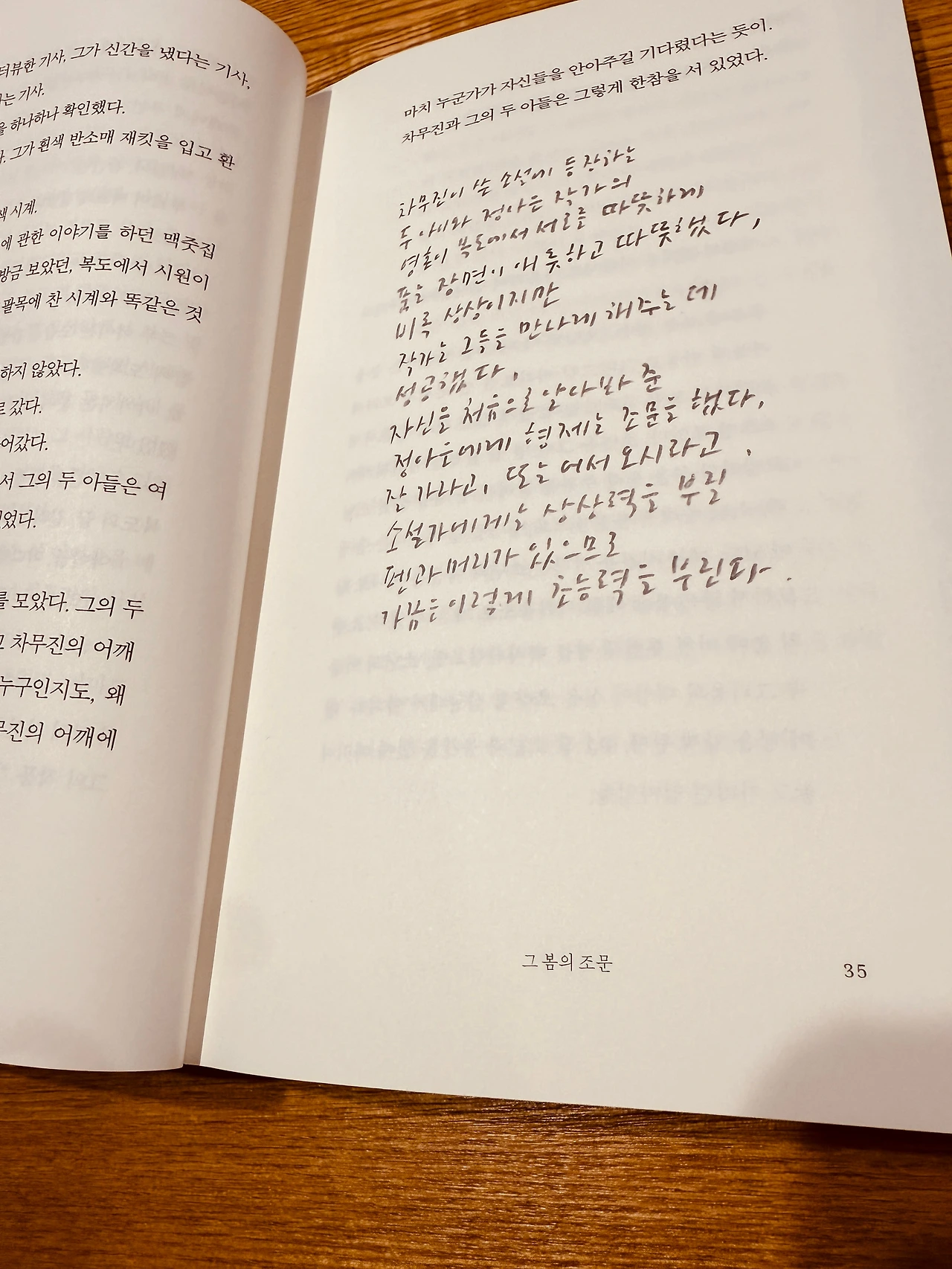 내게 가장 좋았던 작품은 맨 앞에 실린 차무진의 「그 봄의 조문」이다. 자신의 작품을 제일 먼저 알아주고 신문에 서평을 써 준 정아은 작가에게 고마움을 느낀 차무진은 자신의 작품에 등장한 두 소년을 장례식에 등장시켜 정 작가를 조문하게 한다. 두 소년 역시 작품 속에서 죽었기에 이제 막 세상을 떠난 정아은 작가와 두 소년이 병원 복도에서 잘 가라고, 또는 어서 오시라고 따뜻하게 서로를 품는 장면은 애틋하면서도 감동적이었다. 소설가에게는 상상력을 펼칠 펜과 머리가 있으므로 이런 초능력도 가능한 것이다.
