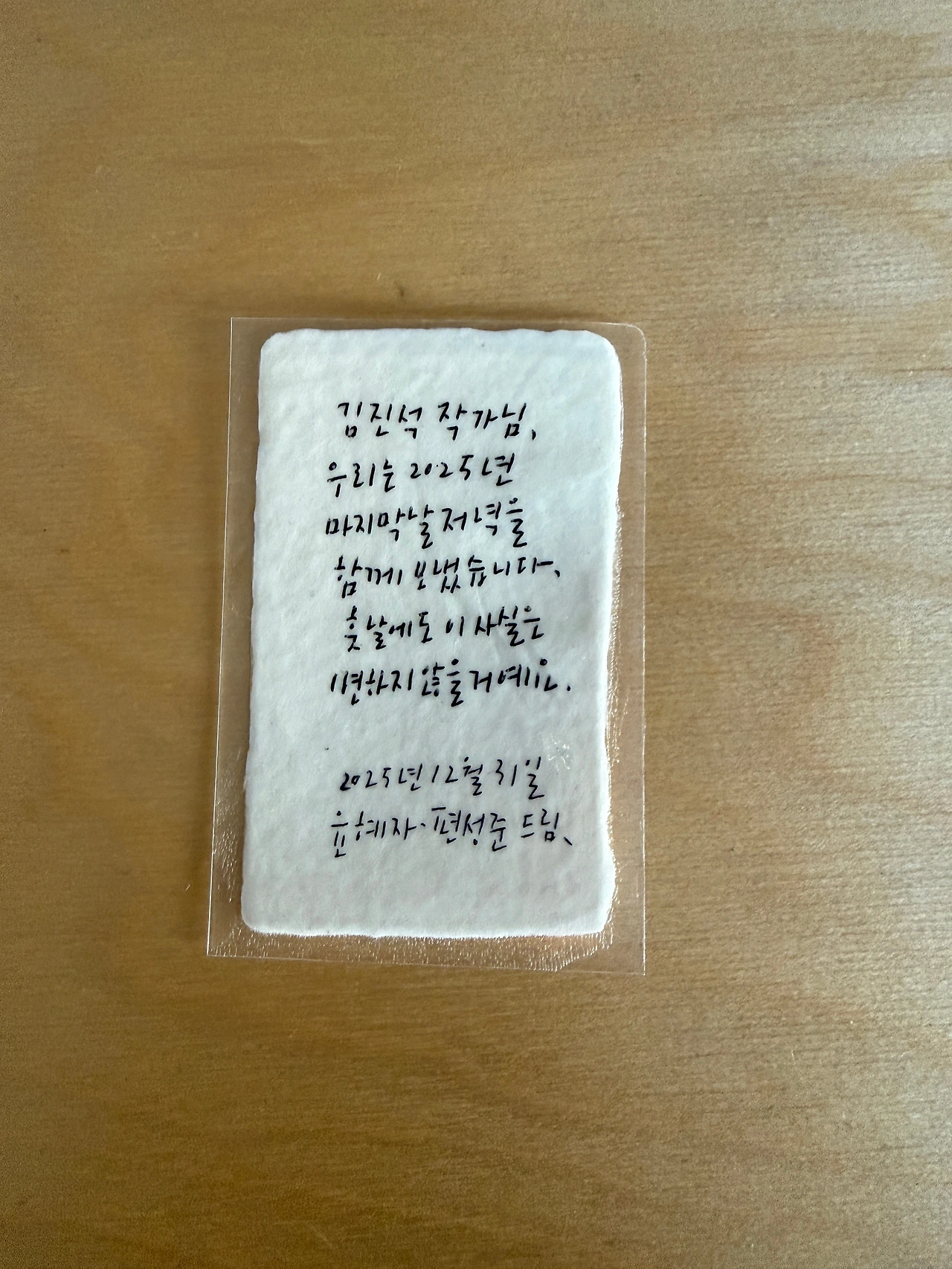 아까 메모만 해놓고 잠깐 낮잠을 잔 뒤 보령으로 내려가는 고속버스 안에서 이 글을 마무리합니다. 2025년 마지막을 함께 해 준 당신들 감사합니다. 그리고 2026년을 함께 열어 준 당신들께도 감사드립니다. 올 한 해도 재미있고 보람도 있고 건강한 나날들을 만들어 봅시다.