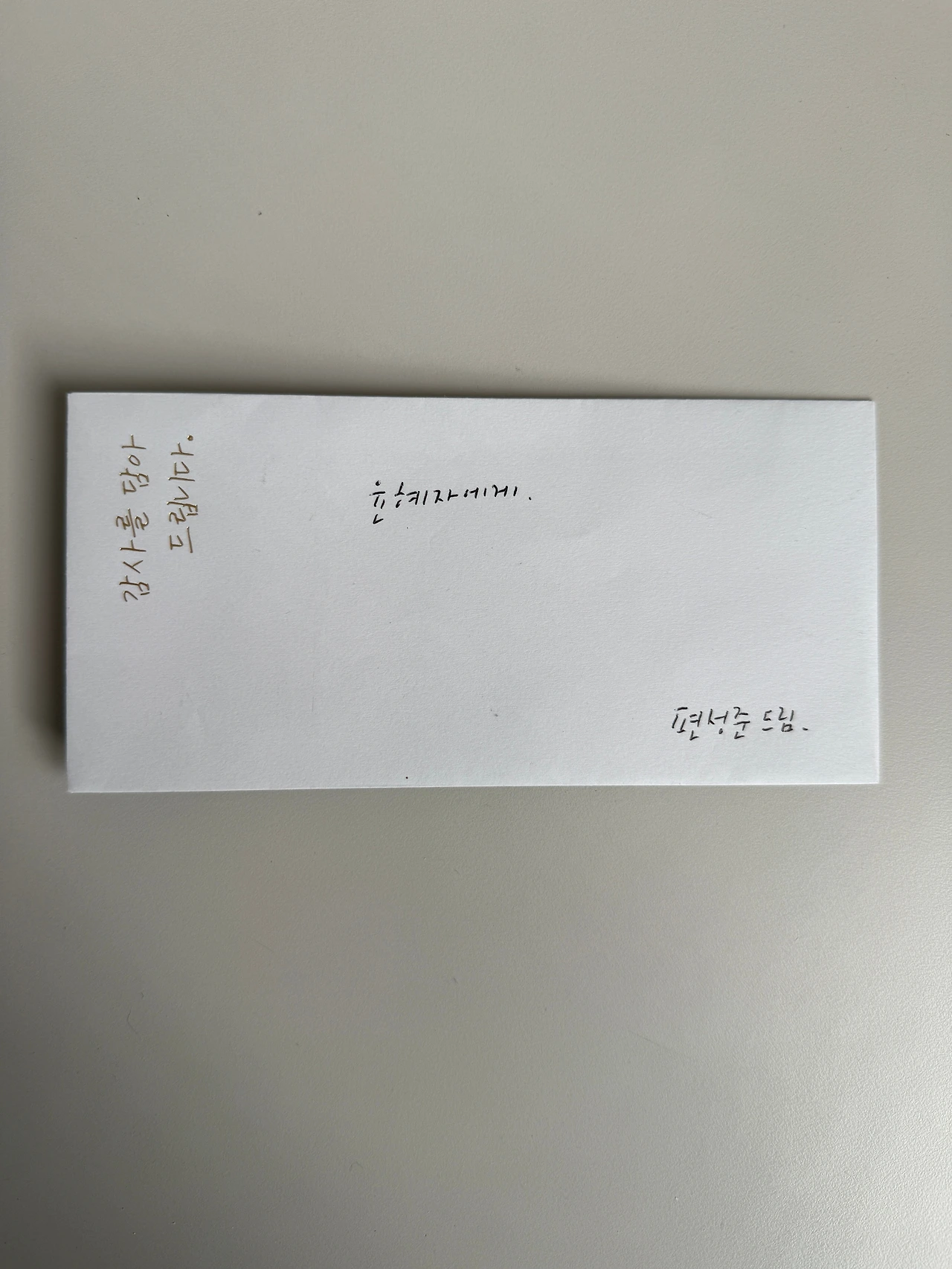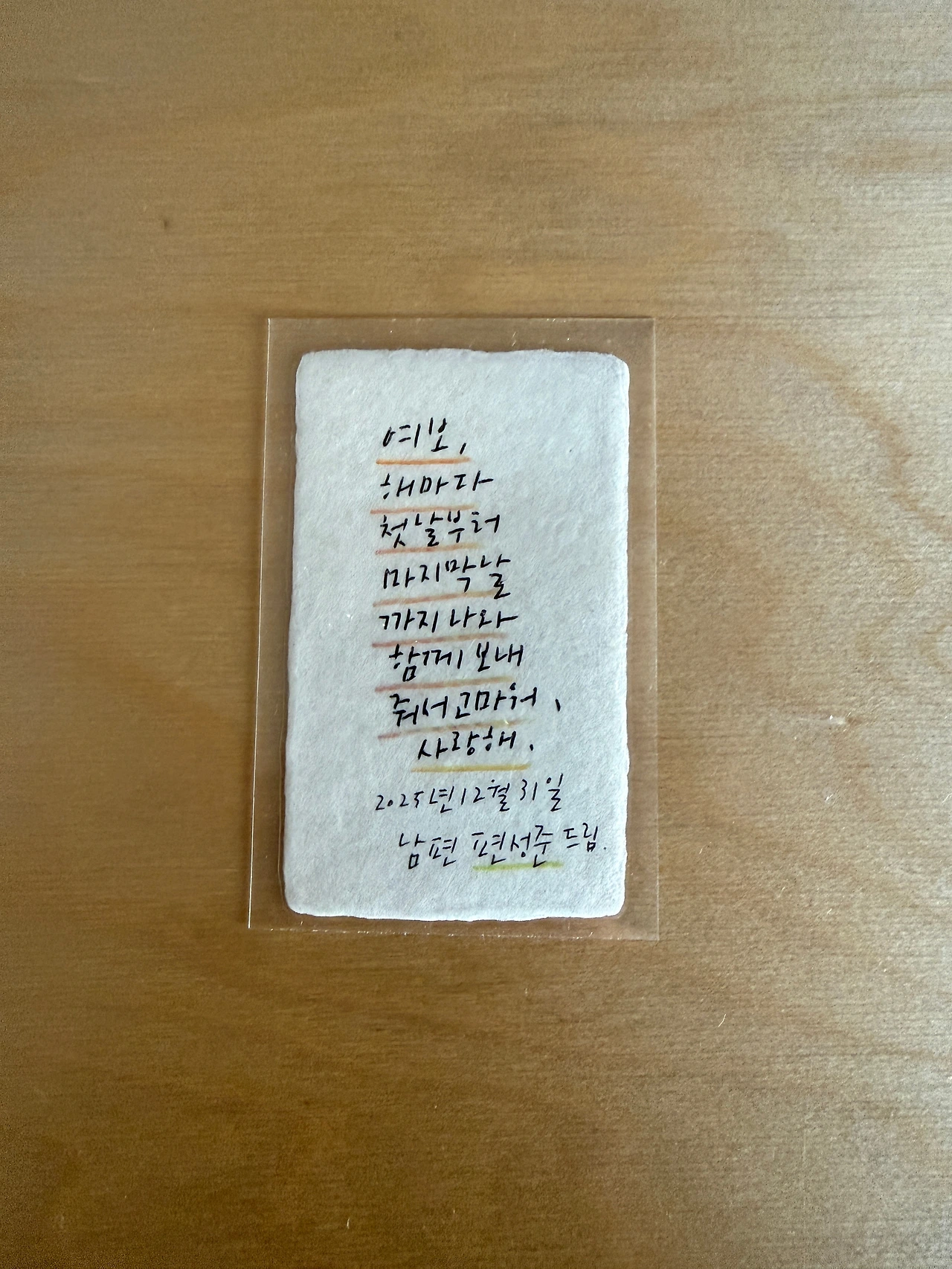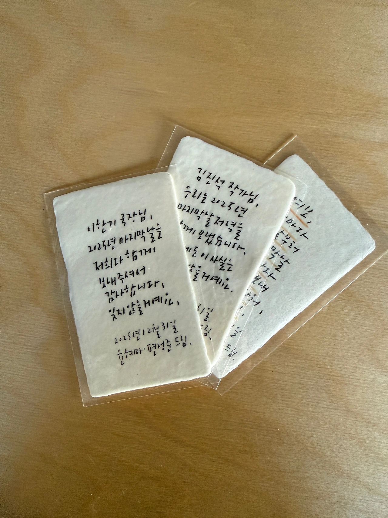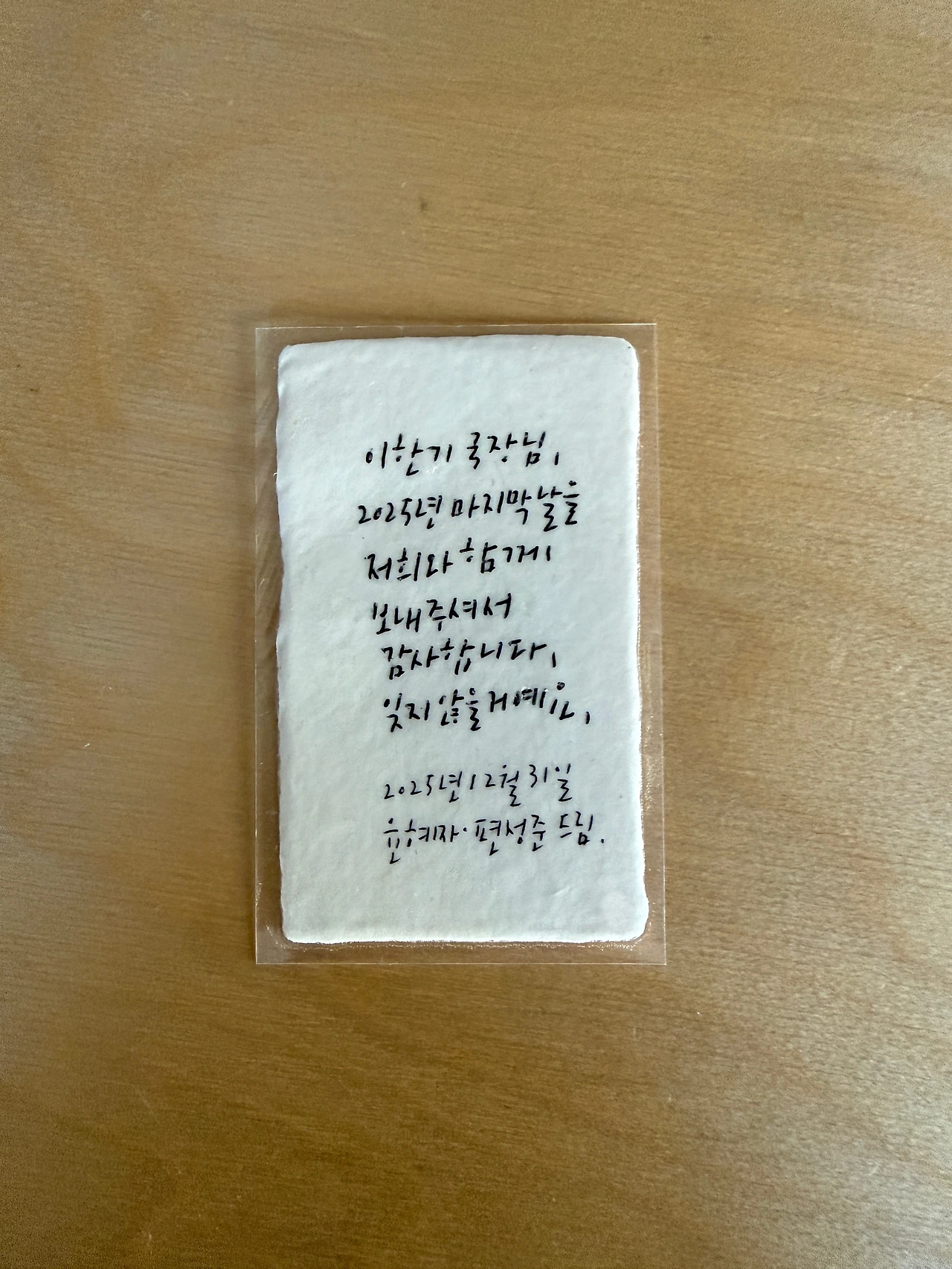 백두산으로 여행을 떠났다가 전날 돌아온 김진석 사진작가도 함께 만나기로 했습니다. 천지 바로 밑에서 눈보라가 쏟아지는 바람에 입산 금지 당하고 이도백하에서 머물다 왔다는군요. 고마운 사람들이죠. 그래서 그 고마운 마음을 쪽지에 써 전달하고 싶어 제가 요즘 명함종이로 쓰는 한지 위에 글을 썼습니다. 한 해가 끝나는 날 우리와 함께 해줘서 고맙다는 평범한 내용이었습니다. 두 사람 걸 끝내고 아내에게 줄 쪽지를 쓰다가 이왕 줄 거 코팅을 하면 어떨까 하는 아이디어가 떠올랐습니다. 아내는 먼저 서울에 가 있고 저만 보령에 있었으므로 혼자 문방구로 달려가 코팅을 했습니다. 카드를 넣을 봉투도 한 통씩 샀죠.